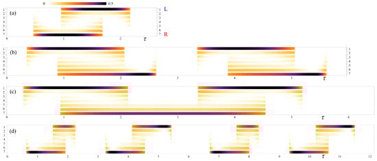 Indeed, the elliptic loop in Figure 5b corresponds to the sequence of two positive edge-state pairs LR–LR in Figure 6b; thus, (similar to the circle Equation (10) with ). The figure-eight loop in Figure 5b demonstrates the sequence LR–RL in Figure 6c, where the two opposite currents cancel each other within one cycle; thus, . The zig-zag loop with has four consecutive negative pairs RL-RL-RL-RL, see Figure 6d, and it realizes the maximal Chern numbers in our system, .