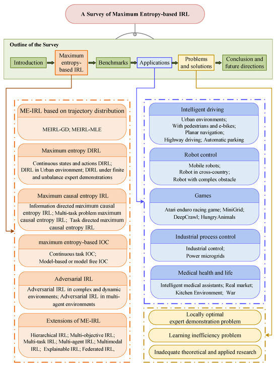 An overview of this survey is illustrated in Figure 1. Section 2 reviews the background of the Markov decision process (MDP), IRL, and ME-IRL algorithms. Section 3 demonstrates the research process of maximum entropy-based IRL algorithms. Section 4 provides benchmark experiments for the application of entropy-based IRL algorithms. Section 5 presents the application progress of the entropy-based IRL algorithms. Section 6 discusses the problems and the existing corresponding feasible solution ideas. And finally, Section 7 concludes this paper and presents future research directions.