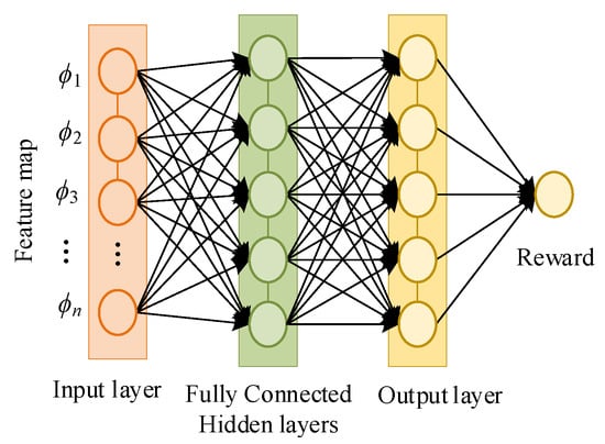 Maximum entropy-based deep IRL solves various types of linear and complex nonlinear reward functions by modeling demonstration behavior as probability distributions over demonstration trajectories and then adding a maximum entropy constraint. In a complex environment, the reward function is formulated as a nonlinear function of the feature vector . A deep neural network (DNN) is used to compute the reward function :