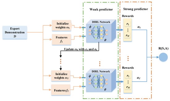Additionally, the finite and unbalanced expert demonstration data, computational complexity, and overfitting in learning nonlinear rewards seriously restrict the development of reinforcement learning. To solve this problem, path integral IRL was first proposed to use a strategy-focused mechanism and a time-focused mechanism to predict rewards and recognize context switches over extended time horizons [71]. And then, a general-purpose planner that combines behavioral planning with local motion planning was introduced into deep maximum entropy-based IRL, which can rely on human driving demonstrations for automatic tuning of the reward function and provide an important guideline for the optimization of the maximum entropy IRL general-purpose planner [39]. For learning rewards in temporally extended tasks, task-driven deep IRL improved the accuracy of the learned rewards through the interactive iteration between the task inference module and the reward learning module [72]. Likewise, the maximum entropy deep IRL used the Adaboost method to integrate multiple ME-DIRL processes into a robust learner, as illustrated in Figure 4 [73]. Subsequently, a motion planning framework was constructed to explore the optimal paths and derive solutions for inverse kinematics in motion planning in robotic environments with obstacles [43].