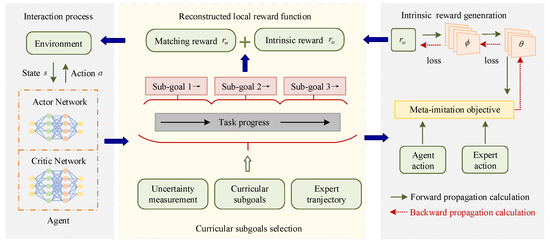 To solve data inefficiency and the poor performance of multi-task imitation learning algorithms in dealing with complex multi-tasks or multi-objectives, some new methods have been introduced. For one, a multi-task hierarchical adversarial IRL was developed to learn multi-tasking strategies with the hierarchical structure, which synthesizes context-based multi-tasking learning, adversarial IRL, and hierarchical strategy learning by identifying and transferring reusable between tasks [92]. The hierarchical HIRL framework split the task into subtasks with incremental rewards, and learned the local reward function of the subtasks using an inferred structure under expert demonstrations [27]. Moreover, to mitigate the limitations of global learning rewards due to redundant noise and error propagation, a new IRL framework based on curriculum sub-objectives guided the agents to obtain local reward functions at each stage [60], as shown in Figure 5. A multi-intent deep IRL framework used the conditional maximum entropy principle to model an expert’s multi-intentional behavior as a mixture of latent intent distributions, and learned an unknown number of nonlinear reward functions from unlabeled expert presentations [26]. For the problem of multiple experts performing tasks in MDP environments, trajectory clusters were used as latent variables in an adaptive maximum entropy IRL, and utilized the mathematical frameworks of probabilistic assignments and utility functions to jointly estimate the discount factor and reward function [93]. In addition, for robots with sequential tasks, rewards were learned based on subtasks defined by the human–computer interaction framework [94]. The Wasserstein IRL for multi-objective optimization used the shadowing gradient method to construct the inverse optimization problem for multi-objective optimization [95].
