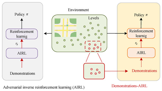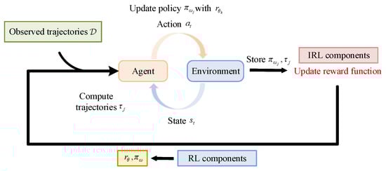 Rapid advancement of reinforcement learning (RL) has catalyzed its widespread adoption in various [1,2], including autonomous vehicles, strategic gaming systems, robot control, industrial automation, financial engineering, and trading [3,4]. At its core, RL algorithms seek to optimize decision policies through dynamic agent–environment interactions. Nevertheless, the design of precise reward functions remains a critical bottleneck in complex dynamic environments, where multivariate interference factors significantly impede theoretical advancements and practical implementations of RL frameworks. To bridge this gap, researchers have pioneered inverse reinforcement learning (IRL), which first infers reward structures from expert demonstrations, and then leverages the acquired reward models for strategic optimization [5,6,7]. The IRL algorithm is derived from imitation learning, originally formulated as behavioral cloning (BC), in which a human expert’s demonstration is recorded and then reinstated in the next execution [8]. Significantly advancing beyond this limitation, modern IRL frameworks possess dual capabilities: (1) extracting latent reward functions from human expertise demonstrations and (2) demonstrating superior domain adaptation capabilities through generalizable policy derivation, thereby achieving enhanced performance and broader operational applicability compared with BC methods [9,10,11,12,13].