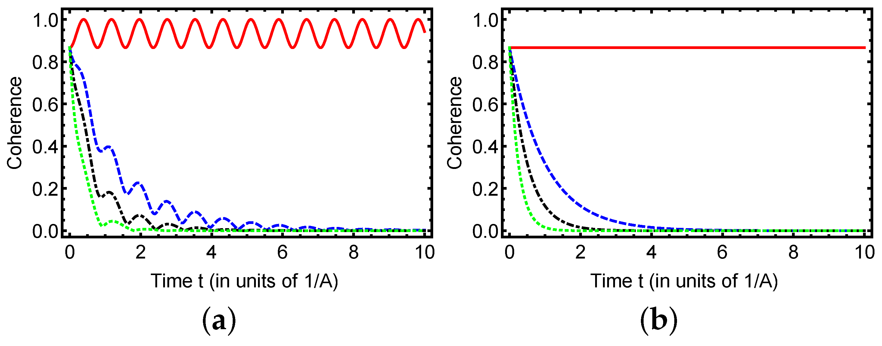 (red solid line), coherence remains constant at its maximum value of 1, indicating perfect preservation of quantum correlations in the absence of dephasing. As
