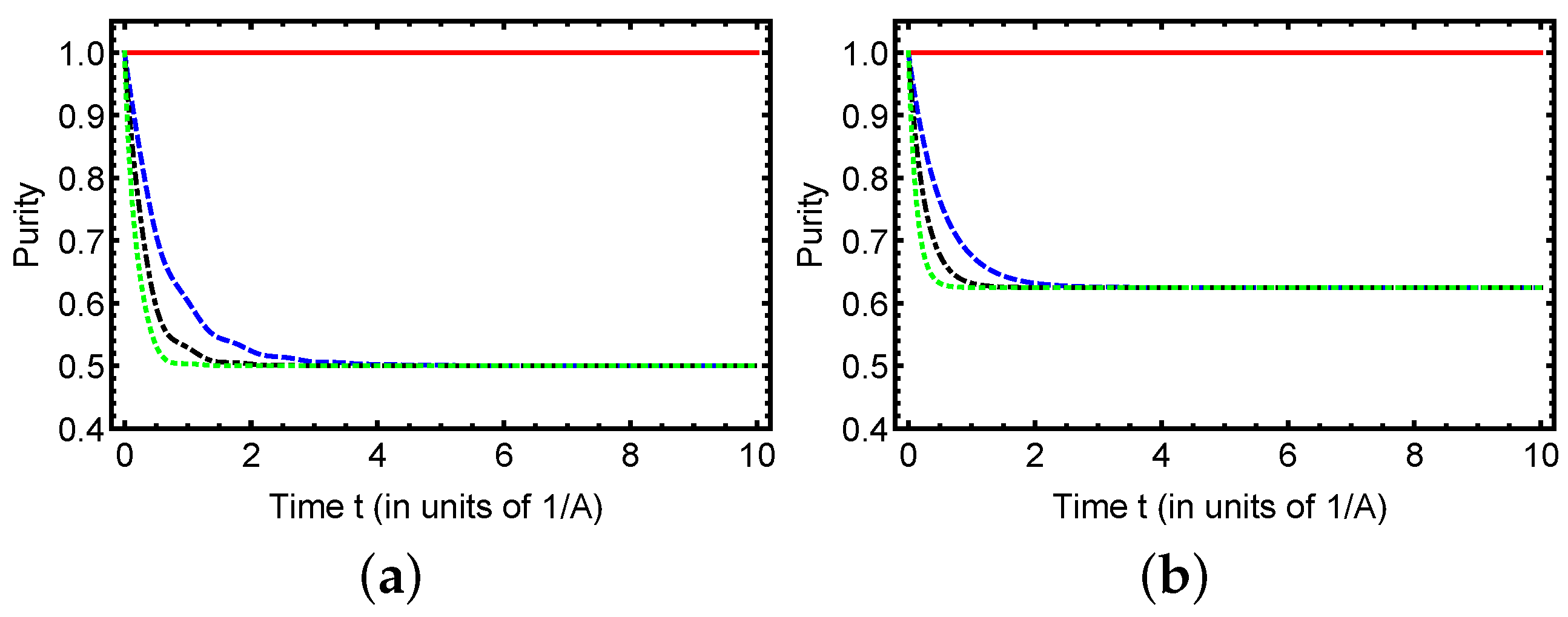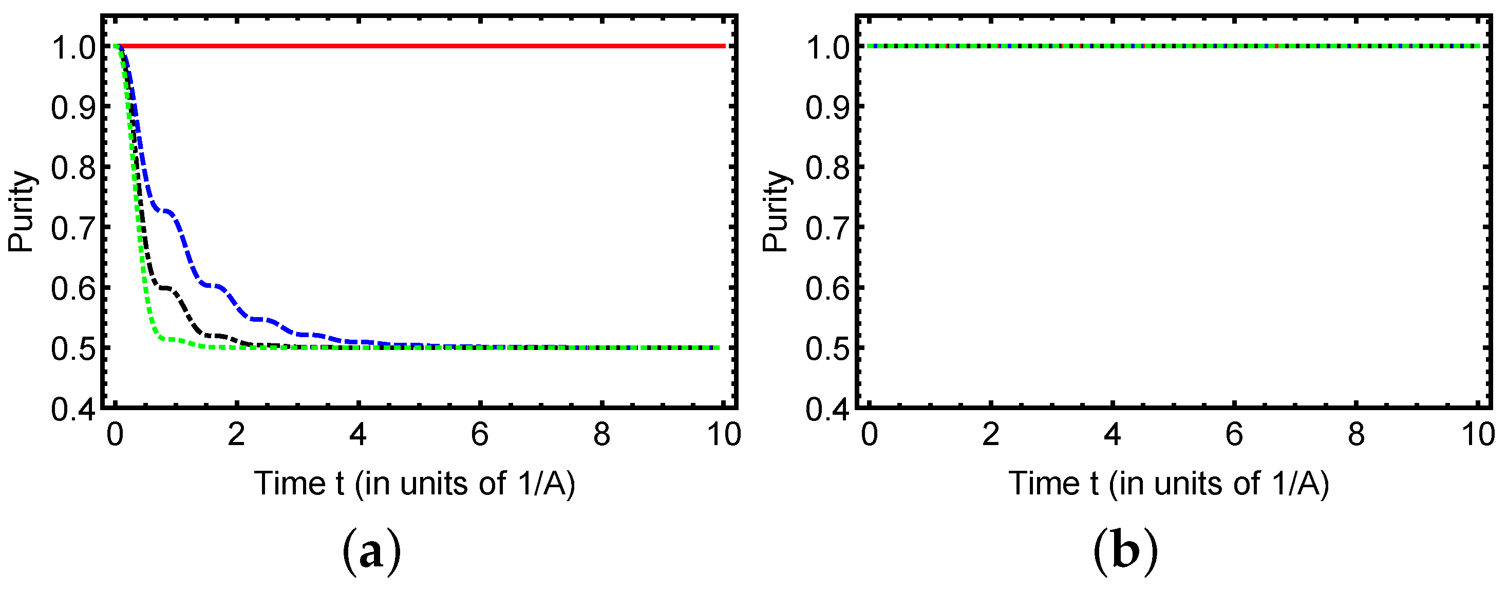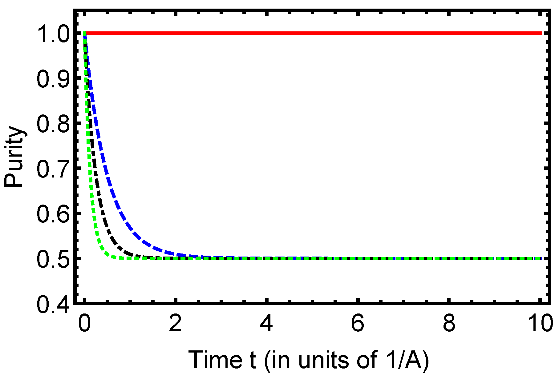 Figure 7 demonstrates the time evolution of purity for maximally entangled initial states (