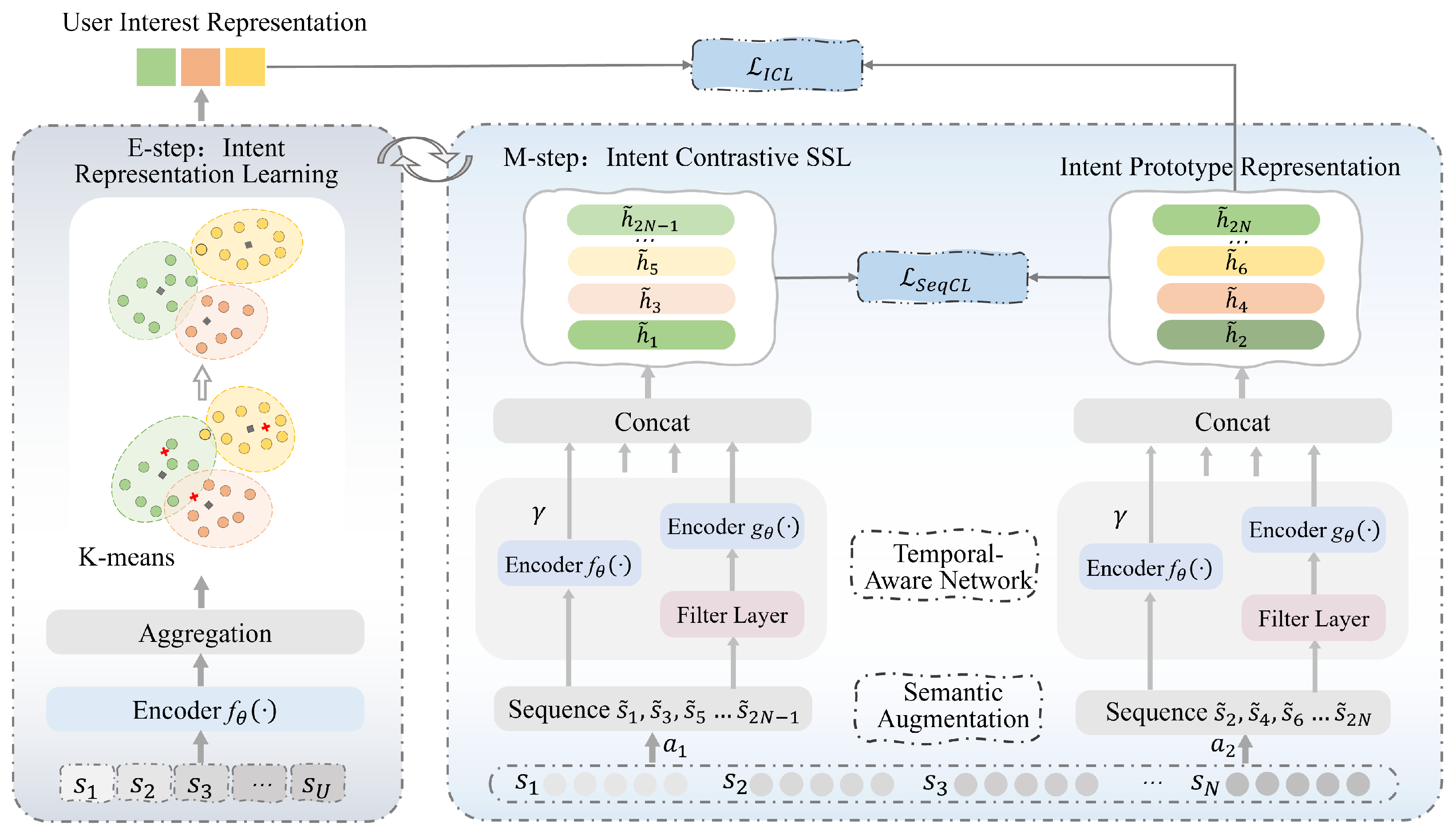 - Qin, X.; Yuan, H.; Zhao, P.; Liu, G.; Zhuang, F.; Sheng, V.S. Intent contrastive learning with cross subsequences for sequential recommendation. In Proceedings of the 17th ACM International Conference on Web Search and Data Mining, Merida, Mexico, 4–8 March 2024; pp. 548–556. [Google Scholar] [CrossRef]