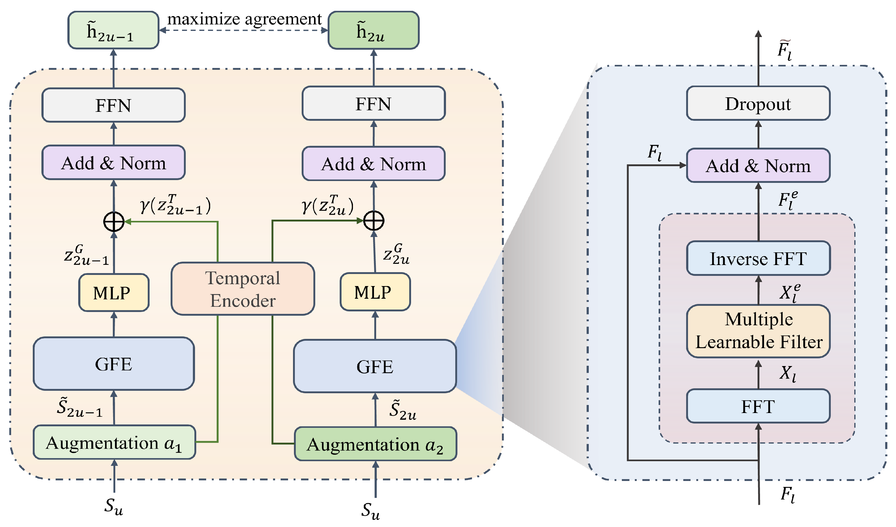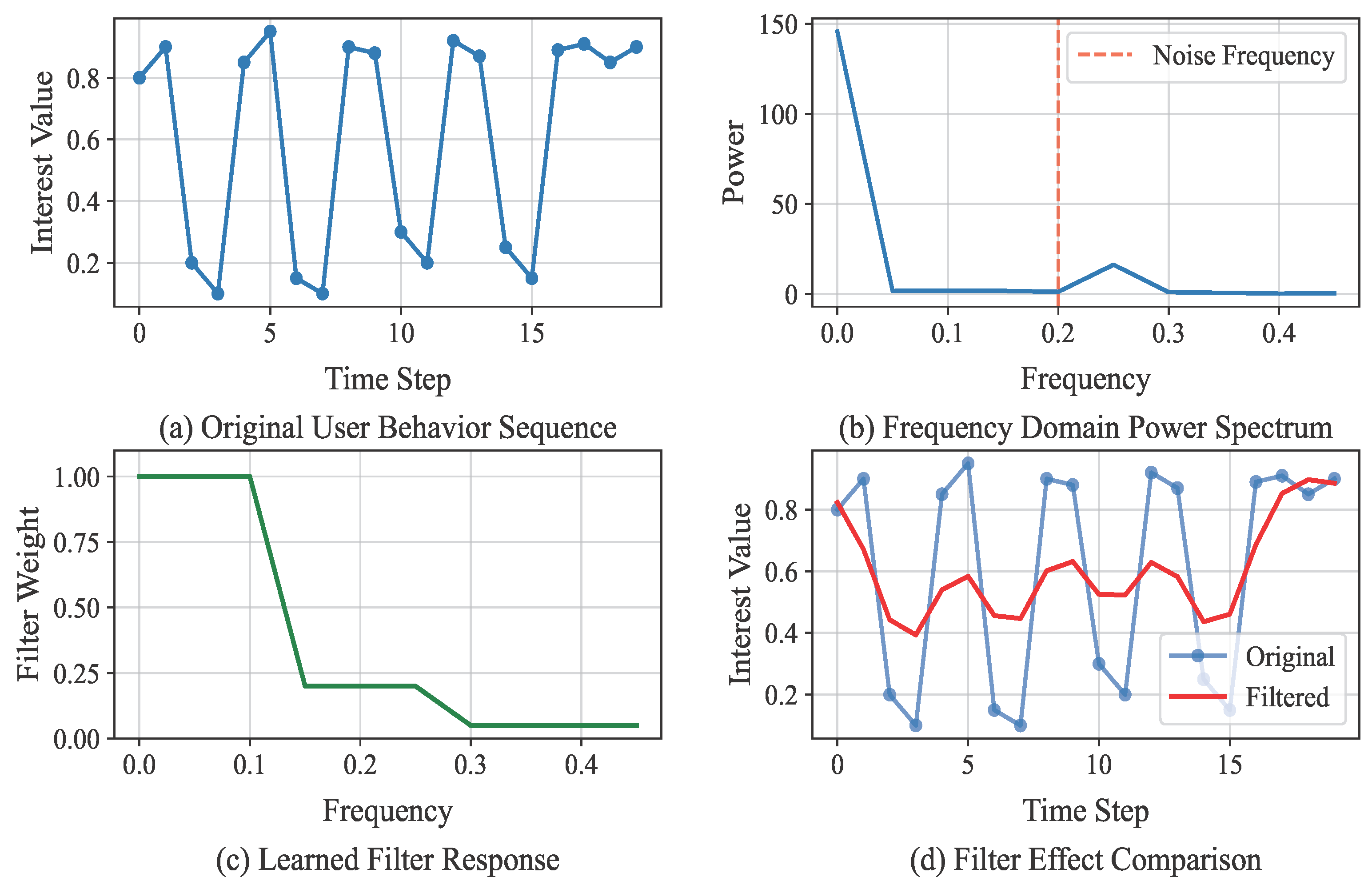 - For sequence modeling, a model-enhanced temporal-aware network is constructed to replace the original Transformer architecture. First, a frequency filter is introduced to adaptively attenuate noisy information in the frequency domain, capturing global features and long-term dependencies in user behavior. Second, an auxiliary temporal dependency modeling encoder is introduced to mitigate the embedding collapse problem caused by using a single sequence encoder, while simultaneously capturing short-term interest dynamics in user behavior. The complementary enhancement between the two modules enables the fusion of diverse temporal dependencies from multiple perspectives, thereby strengthening the temporal perception capability for both long- and short-term user behavior patterns under global patterns.