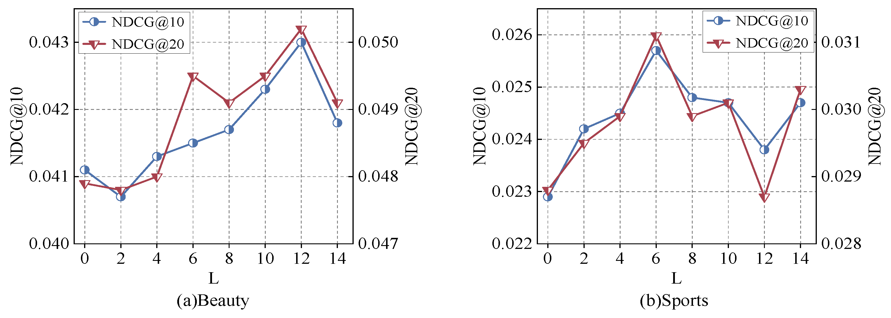 - Standard sequential models: GRU4Rec [9] is a prevalent RNN variant designed to address the vanishing gradient problem in traditional RNNs when processing long sequences. SASRec [12] employs the self-attention mechanism from Transformer models as its core approach to effectively capture sequential dependencies in users’ historical behaviors.