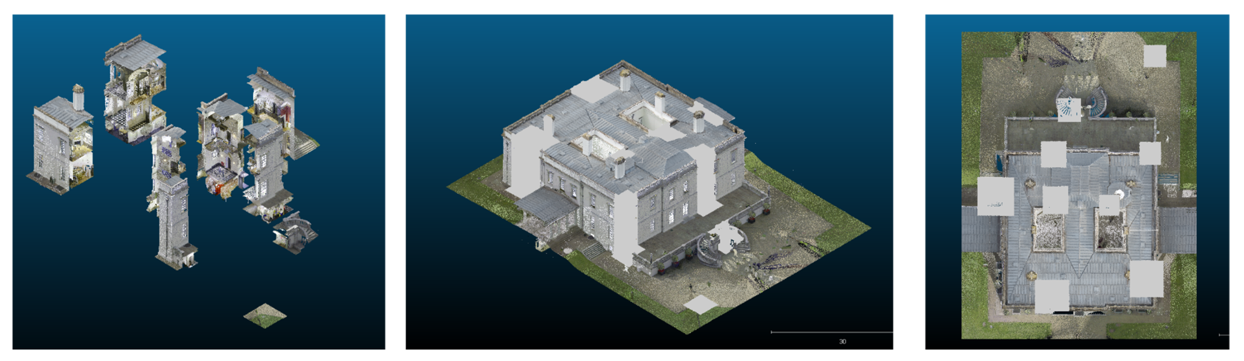 The research is set in the Queen’s House, Greenwich, which is an iconic heritage building managed by Royal Museums Greenwich (RMG). Queen’s House was designed by Inigo Jones in the early 17th century and is renowned as the first classical architecture building in England [28]. It now functions as a museum space, showcasing historical artefacts, and it is part of the Maritime Greenwich UNESCO World Heritage Site. This site was selected because it offered a rich variety of architectural components such as columns, decorative ceilings and grand staircases to test the classification approach. It also provided a real-world scenario where an accurate HBIM model would be valuable for conservation management and public presentation. Access to detailed survey data of the building was made possible through the collaboration with RMG (Royal Museum of Greenwich) and their digital survey partners. In Figure 1, the original point cloud dataset indexed in RBG colours is shown with the 16% labelled dataset, which is further shown in RGB in Figure 2 as the manually labelled training dataset.