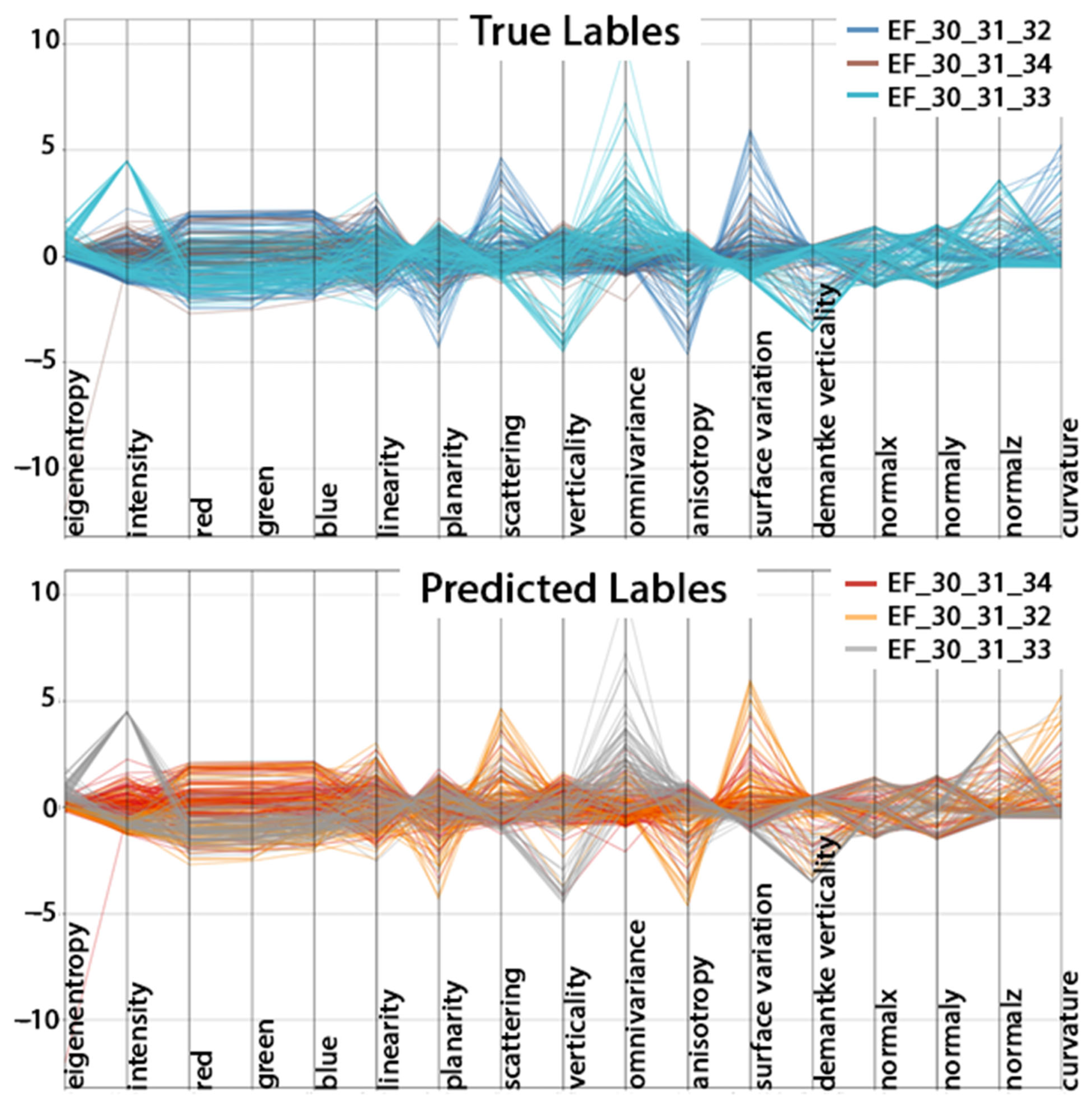 Within the Wall (EF_30) hierarchy, a Level 3 classifier was tasked, for instance, with distinguishing wall ornaments from plain wall surfaces, or identifying rainwater downpipes affixed to walls. Figure 7 shows the plot for the true labels and predicted labels at Level 3 for wall ornaments (EF_30_31_32), rainwater goods (EF_30_31_33) and walls (EF_30_31_34) in relation to the RF features.