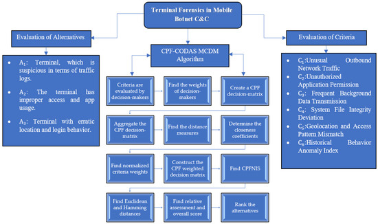 To conclude this paper, it is proposed that a new framework utilizing CPF-CODAS for analyzing terminal behavior introduces the capability of detecting command and control in mobile botnets. This study demonstrates the application of an effective MCDM method suitable for cybersecurity, as it combines advanced fuzzy logic to provide a robust and systematic approach to digital forensics. The proposed method enhances detection levels, models uncertainty, and supports sound decision-making by cyber-defense practitioners working in terminal-rich environments.