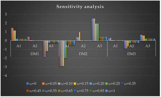 The sensitivity of the suggested CPF-CODAS method was established through a sensitivity analysis, where the threshold coefficient was varied from to . This coefficient is used to offset the emphasis between both Euclidean and Taxicab distances in the CODAS method. The performance score of each of the three alternatives , and were analyzed with varying values of omega under each decision-maker, as shown in Figure 3. The outcomes have evident changes in ranking at a particular weight. As an example, in the case of , has an initial score of at , but greatly decreases to at , signifying a severe reliance on the distance measure setup. A sudden decrease in score between is observed on of (when ) to 0.440 (when ), but the same terminal will nonetheless remain as the highest-ranked one where this expert is concerned. The assessments of have moderate changes, though in the same observation as would be the most suspicious terminal at different values of omega. In general, the sensitivity testing demonstrates the congruency of the alternative as the most serious suspect in every scenario, which proves the quality of the decision and the soundness of the CPF-CODAS model in the terminal forensics of mobile botnets C&C identification.