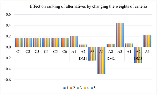 Effect on the ranking of alternatives by changing the weights of criteria.