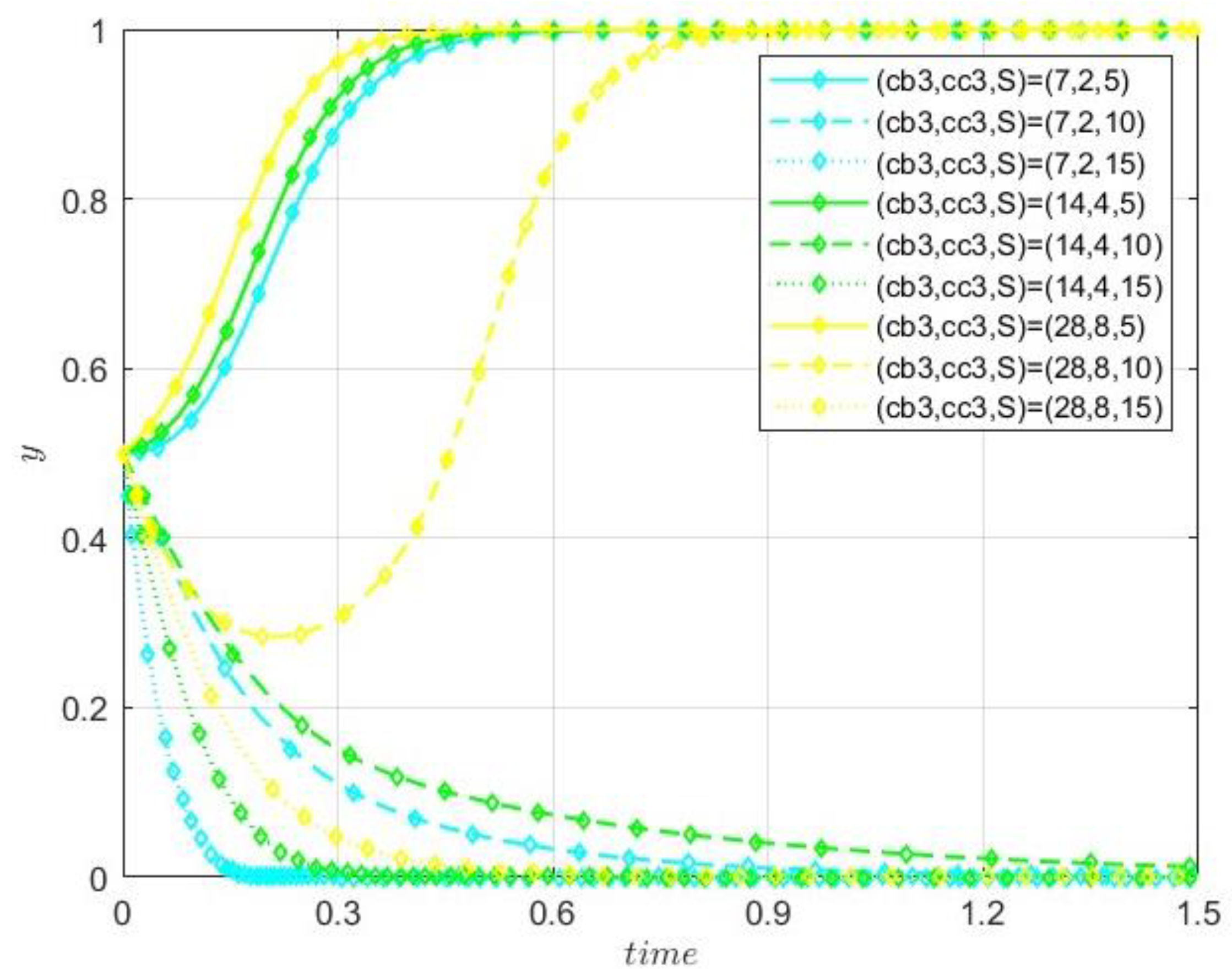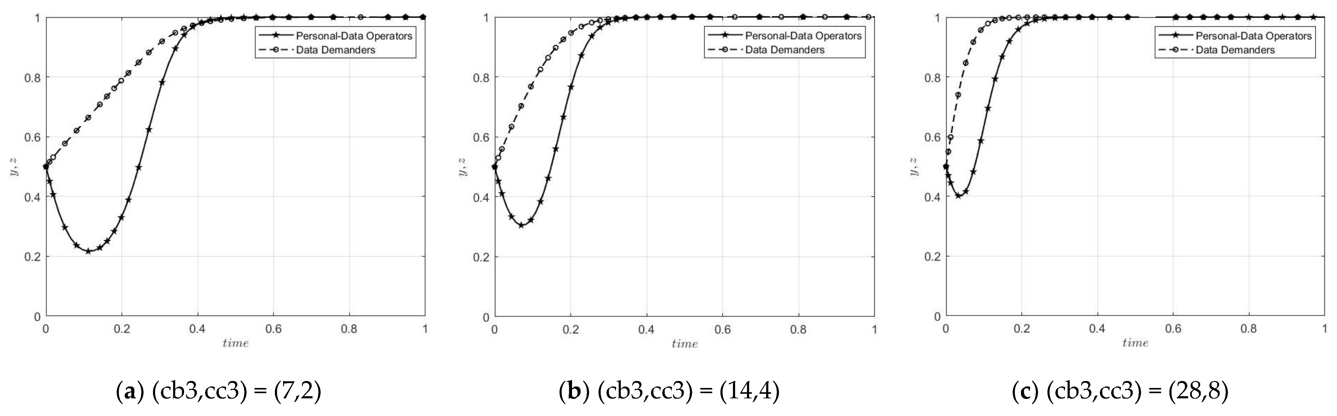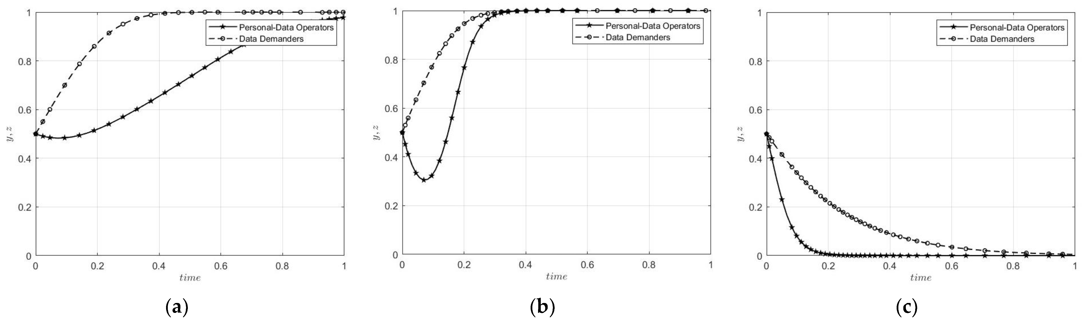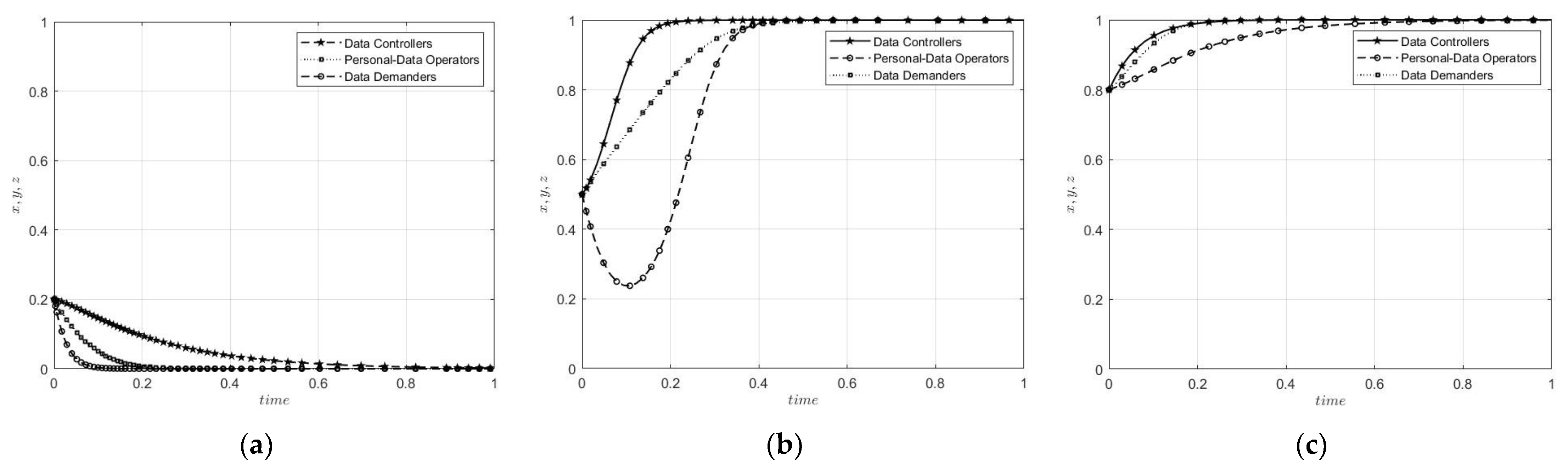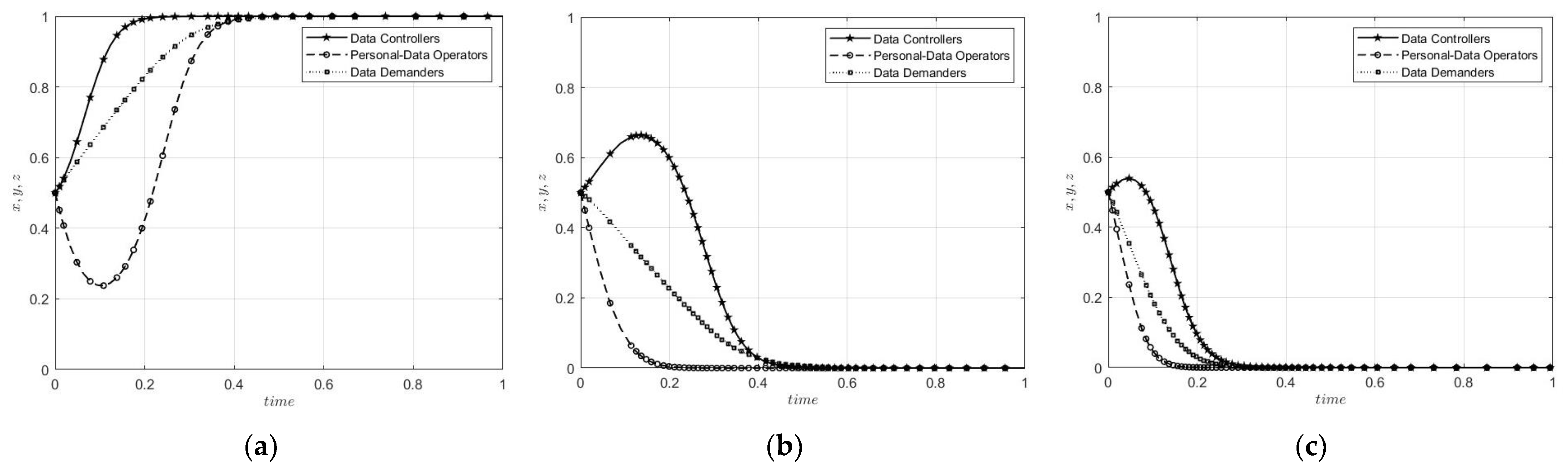 - Initial willingness exerts a pronounced influence on strategy evolution. The initial willingness of data controllers, personal-data operators, and data demanders positively drives the evolution of data-trading behaviors. When the initial willingness of all three parties is high, the data controller’s choice to “circulate” data is only weakly affected by the willingness of operators or demanders, whereas the operator’s willingness to participate is strongly driven by the demanders’ intentions. Conversely, when initial willingness is low, all parties tend to withdraw from trading, creating a vicious cycle of “unwillingness to circulate.”