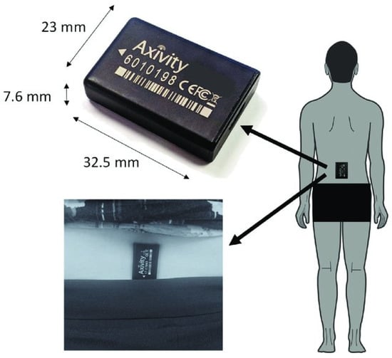 The AX3 (Axivity, York, UK) is a tri-axial accelerometer-based wearable activity monitor (costs ≈ £100; 23.0 × 32.5 × 7.6 mm; weight 11 g). It features 512 MB memory, a 14-day battery life, and records acceleration at 100 Hz (16-bit resolution, ±8 g). Data were stored locally and downloaded after each walking trial. The device was secured at the fifth lumbar vertebra (L5) using double-sided tape and Hypafix (BSN Medical Ltd., Hull, UK) (Figure 1).