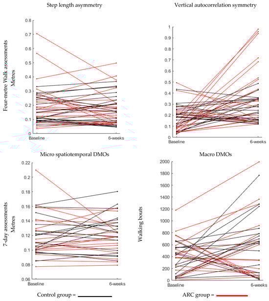 Further visualisation of the variables with the greatest differences achieved in the change scores between the ARC and control group for each test condition is displayed in Figure 3. Here, we see how each individual responded to step length asymmetry and the vertical autocorrelation symmetry recorded during the four-metre assessments, as well as for swing time asymmetry and the number of bouts per day for the 7-day assessment data following the 6 weeks of interventions.