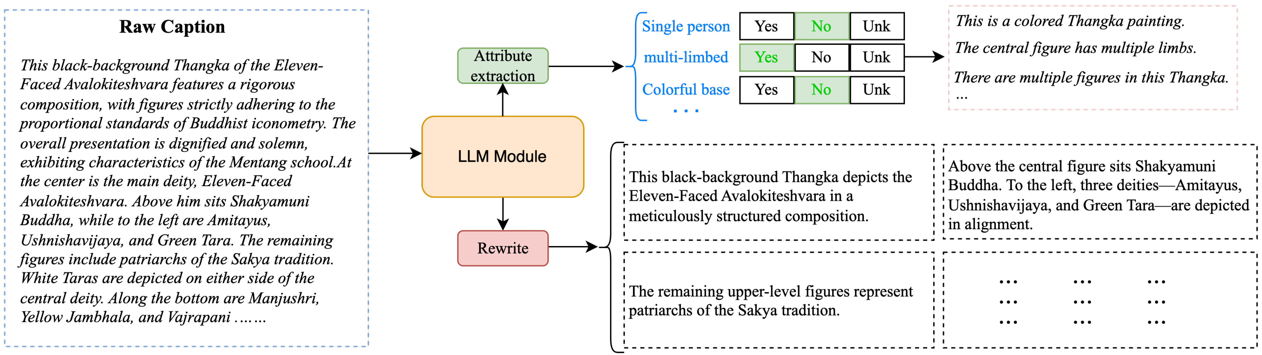 On the textual side, raw Thangka captions are often verbose and narrative, making them difficult to directly align with visual features. To extract structured symbolic knowledge and improve semantic clarity, we introduce a large language model (LLM)-based augmentation pipeline, as illustrated in