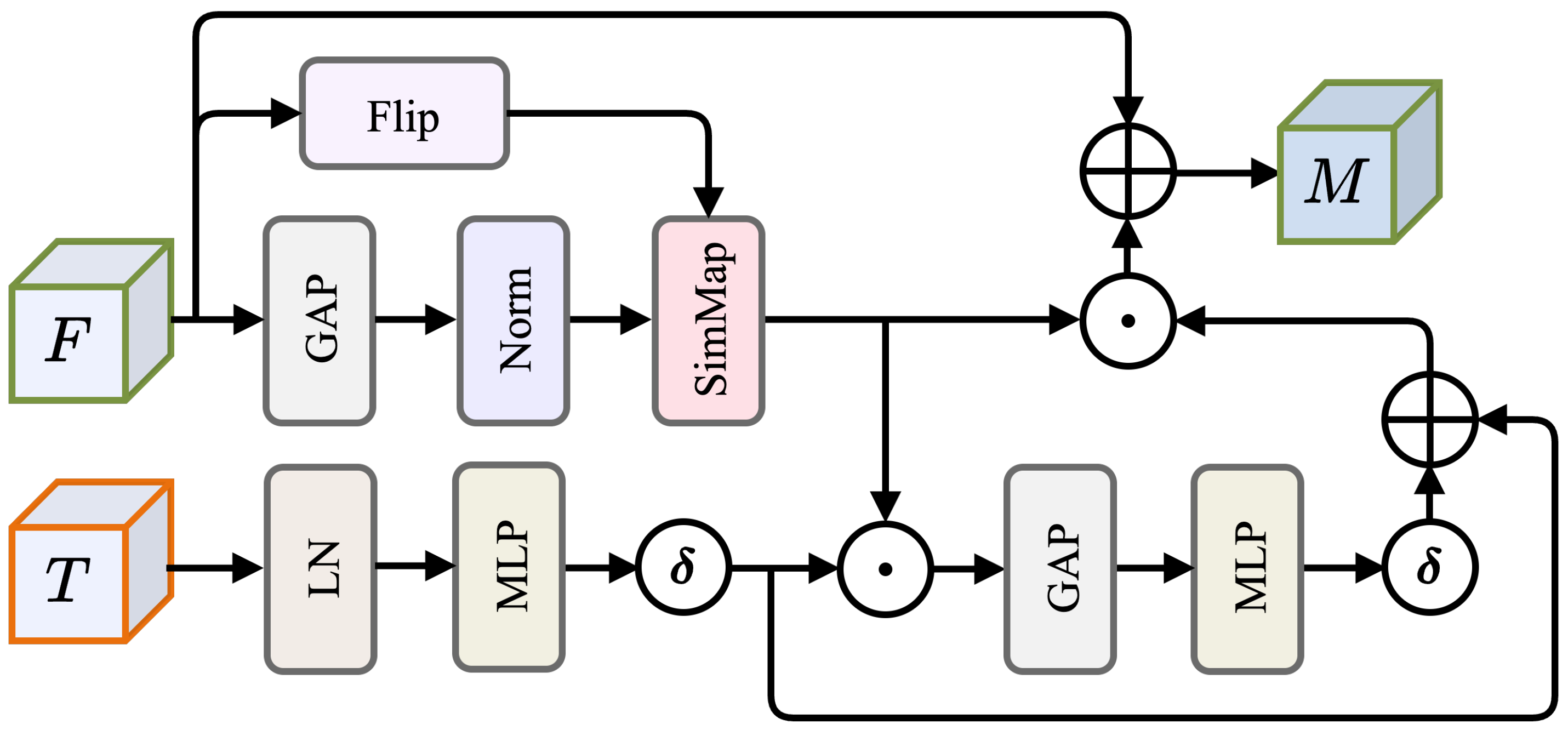 is compressed via GAP and then passed through an MLP with sigmoid activation to generate a correction signal. This signal is combined with