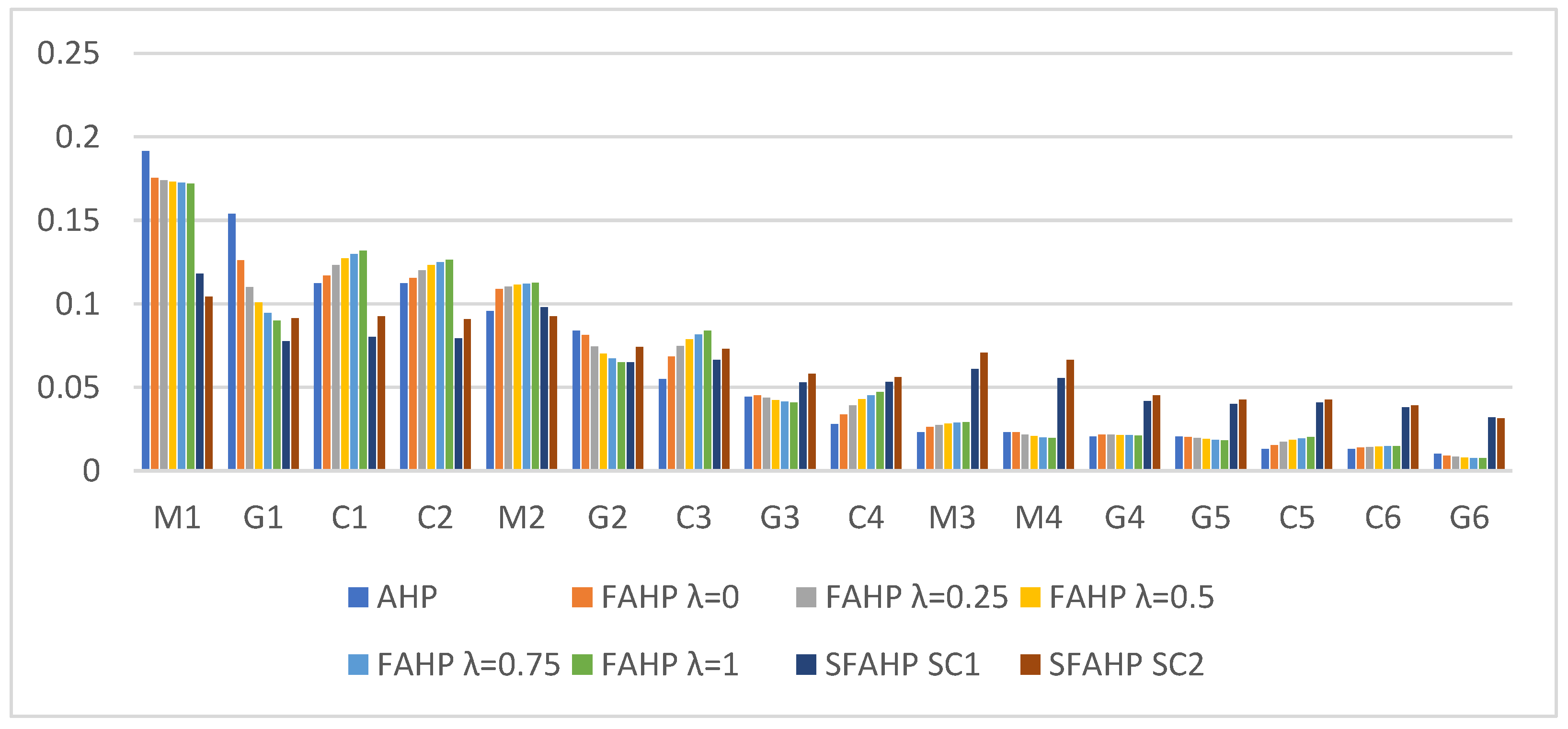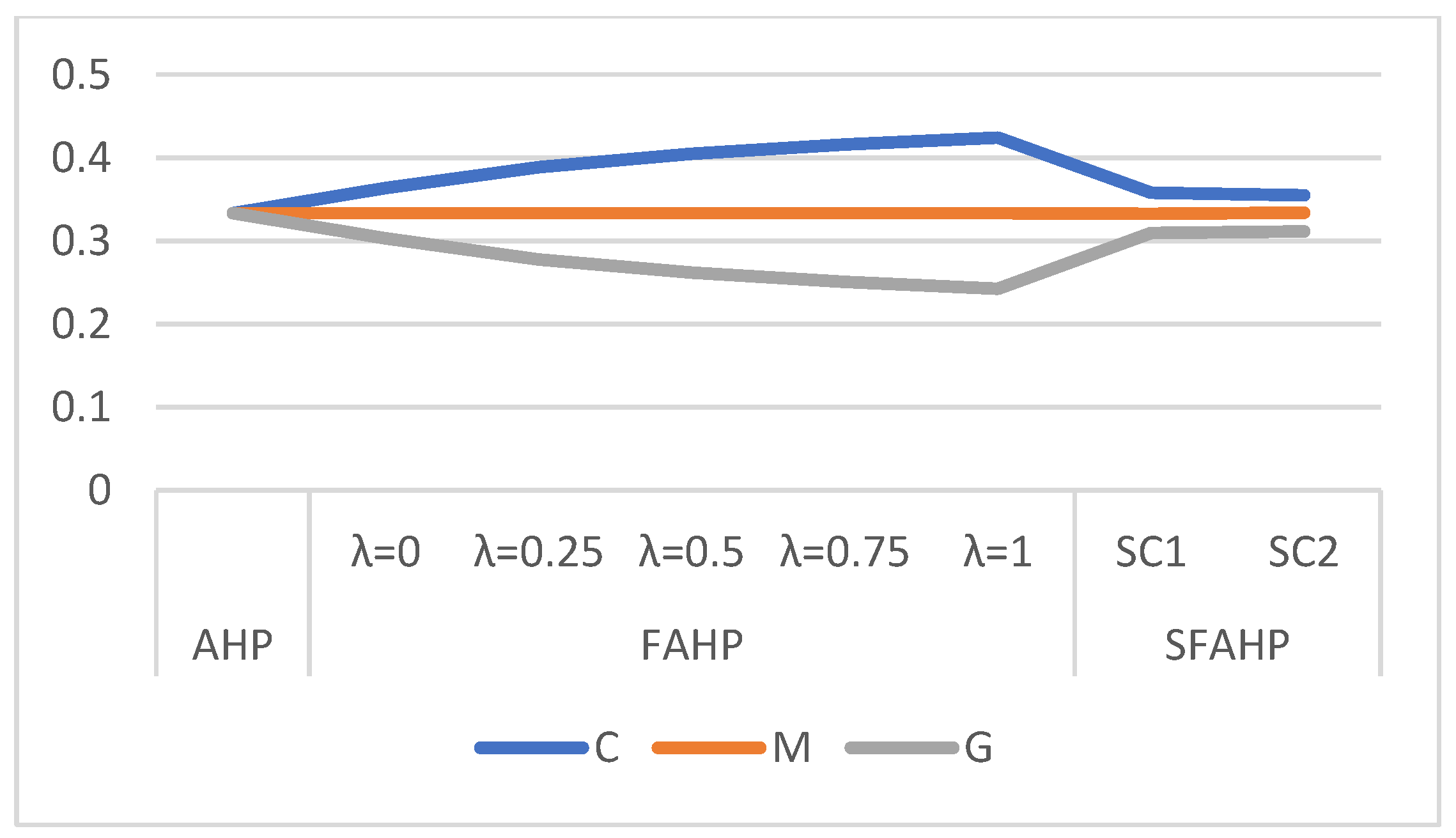 = 3). In the AHP case, the weights of main criteria G, C, and M are equal to 0.33, as can be seen in