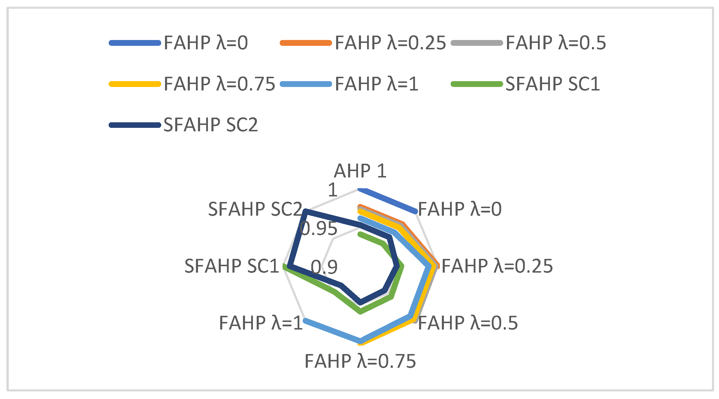 During the sub-criteria ranging process, eight different variants were used, possibly leading to inconsistencies. To estimate and analyze ranking similarities applying the AHP, the FAHP (five different situations), and the SFAHP (two different situations) to all influencing sub-criteria, as well as to assess the accuracy and validity of the proposed model, the Spearman rank correlation coefficient [