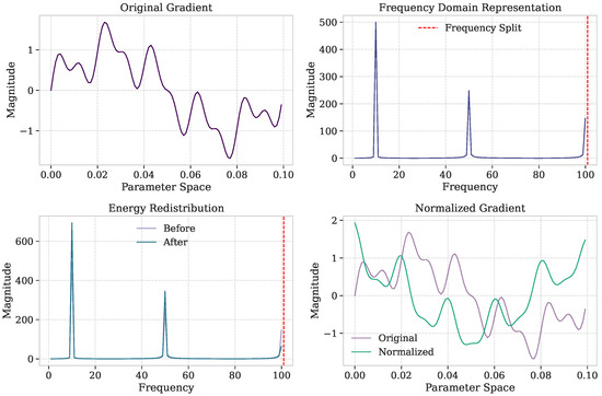 Energy redistribution is accomplished by scaling the magnitude of frequency components while preserving phase information, ensuring that directional properties of the gradient remain intact. This selective scaling is critical, as it modifies energy distribution without disrupting the fundamental update direction.