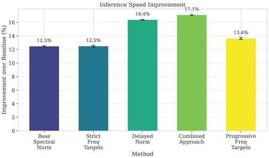 Inference speed improvements relative to the baseline. All GSN variants significantly outperform the baseline, with the Combined Approach (Run 4) achieving the highest improvement of 16.7%.