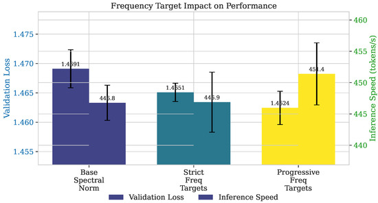 Comparison of different frequency targeting strategies showing the trade-off between validation loss and inference speed. Stricter frequency separation improves validation performance with minimal impact on speed, while progressive targeting balances both metrics.