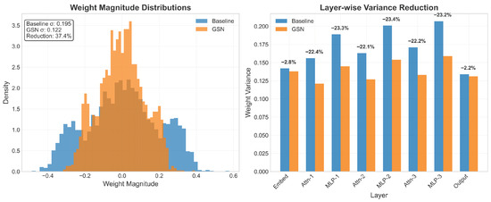 Weight distribution analysis comparing baseline and GSN-trained models. (Left) Weight magnitude histograms showing GSN’s effect on creating smoother distributions. (Right) Layer-wise variance reduction demonstrating improved parameter conditioning.