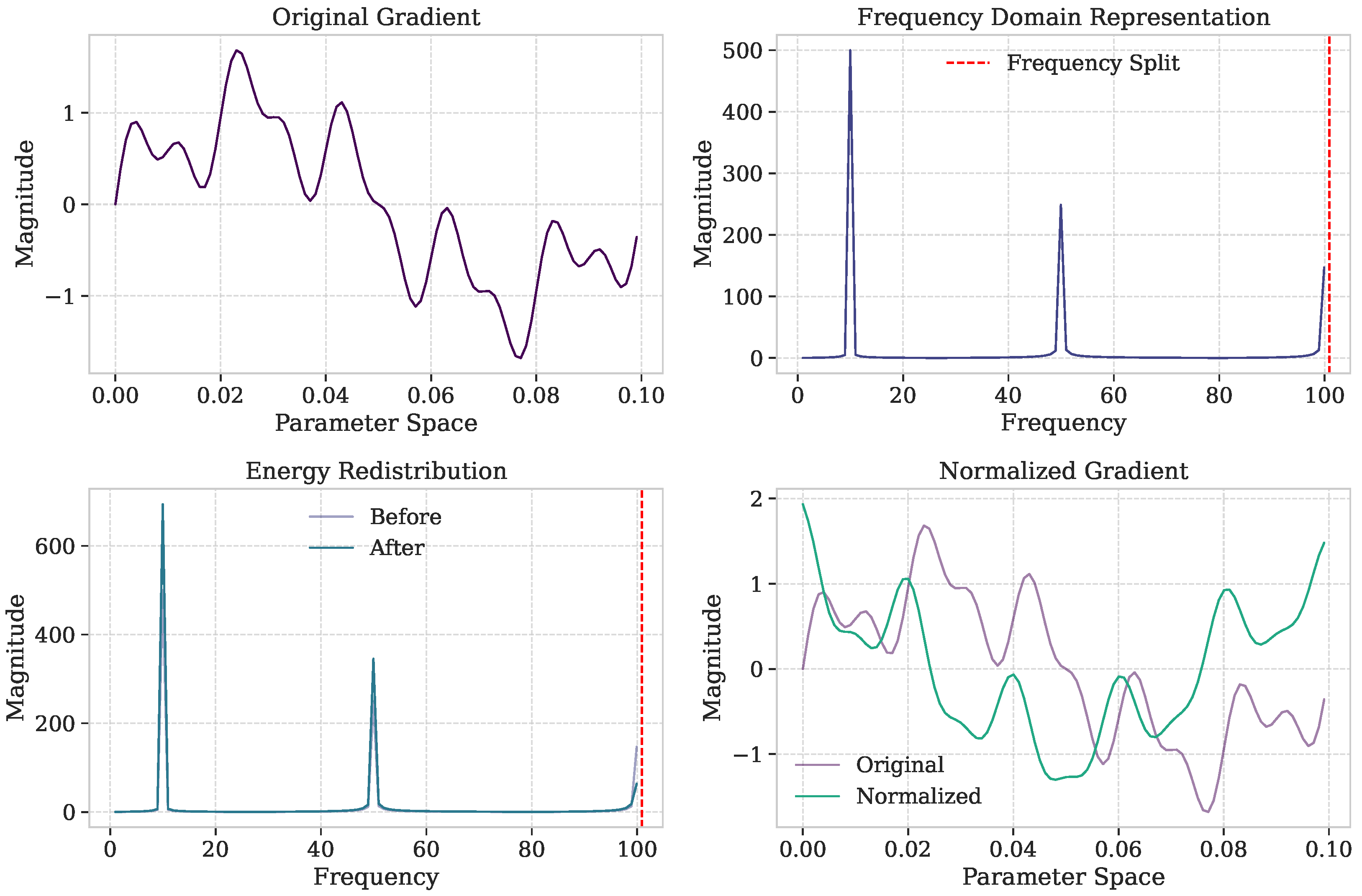 9]. Intuitively, this transformation allows us to “see” the gradient through a different lens: instead of viewing gradient updates as raw parameter changes, we decompose them into oscillatory patterns of different frequencies. High-frequency components correspond to rapid, fine-grained adjustments (often associated with overfitting), while low-frequency components represent smooth, global patterns (associated with generalization). By controlling the energy balance between these components, we can guide the optimization process toward more desirable parameter landscapes. This transformation decomposes the gradient signal into its constituent frequency components, revealing the energy distribution across the frequency spectrum. The mathematical formulation is