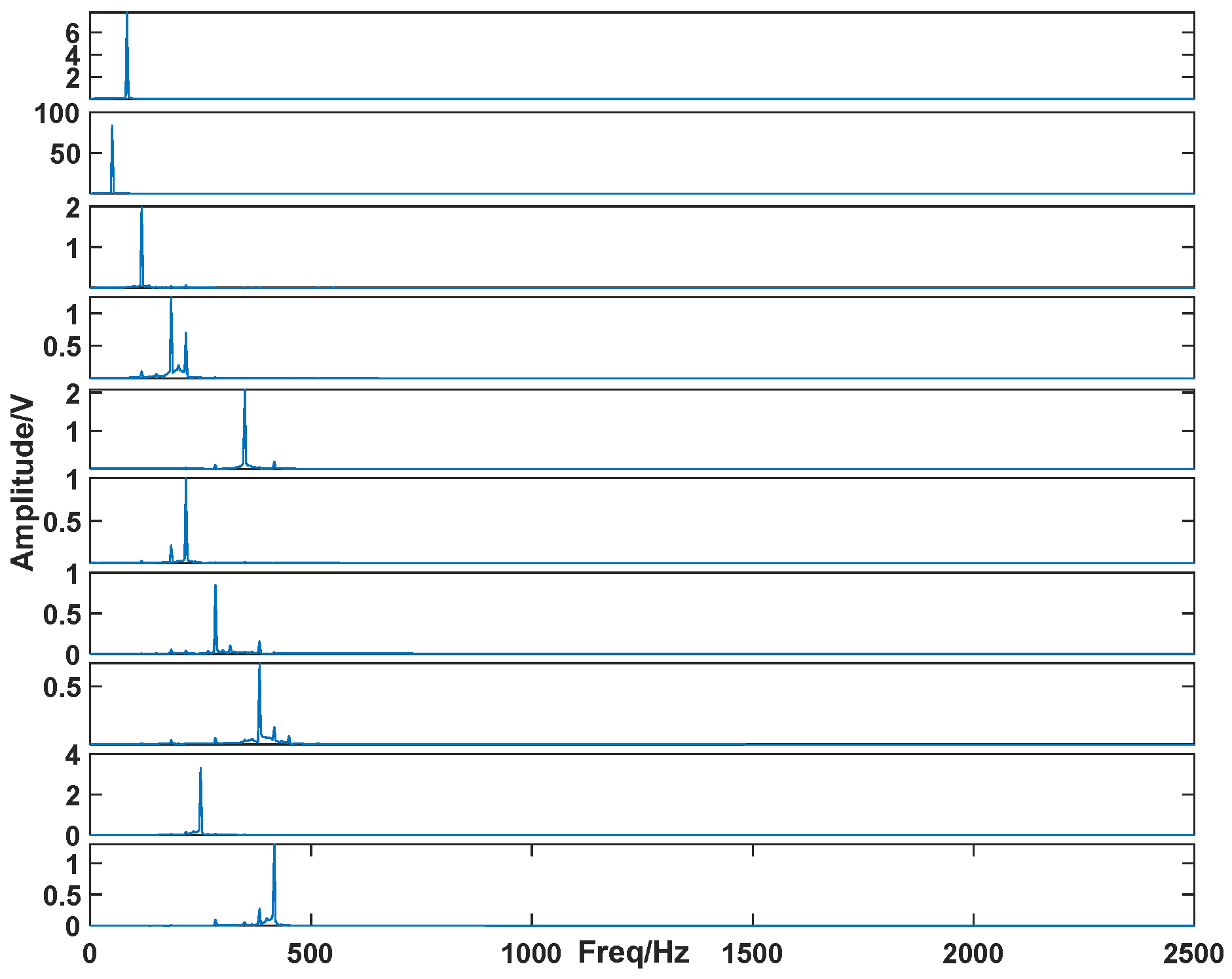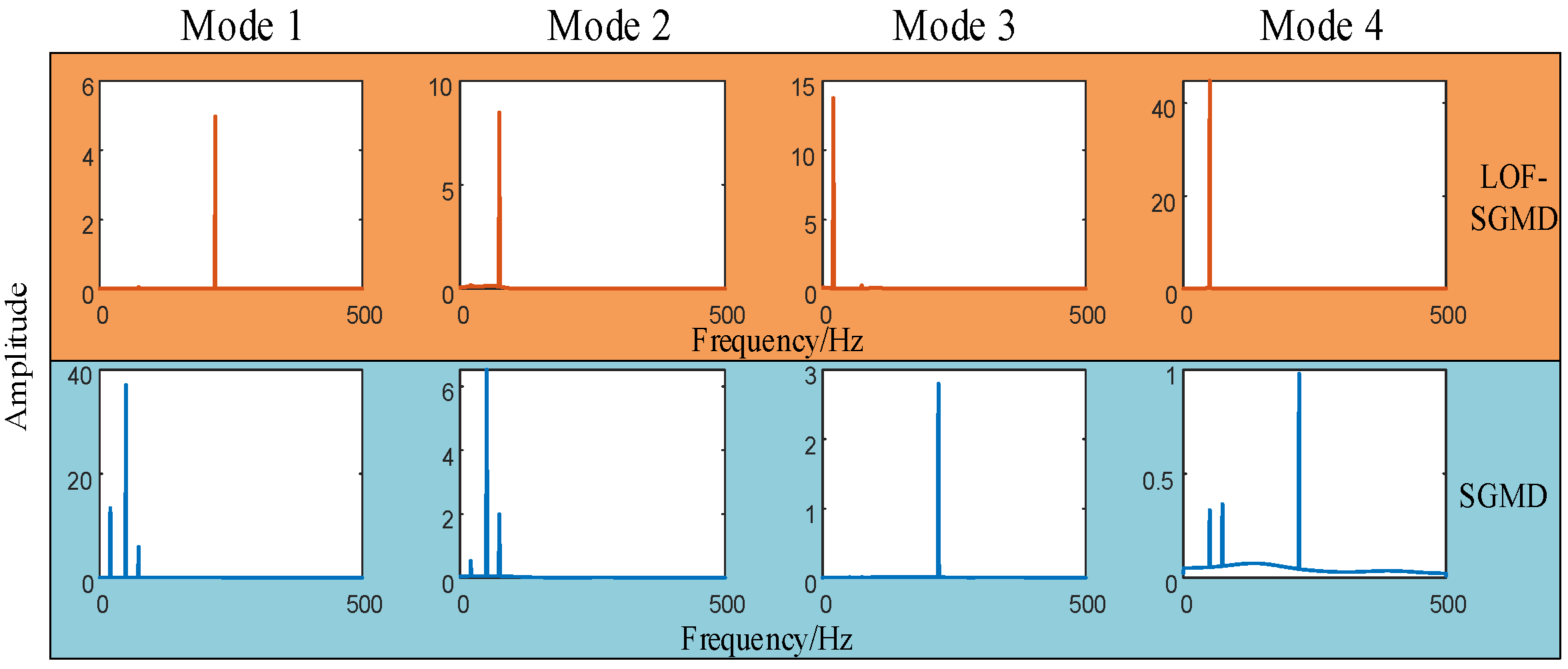 - Consequently, the frequency domain attributes of each decomposition mode are evaluated utilizing the local outlier factor. If Equation (16) is not satisfied, repeat step (1). Otherwise, it is regarded as complete decomposition.
