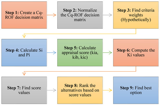This section outlines the proposed methodology of Cq-ROF-CoCoFISo, which combines the strengths of Cq-ROFSs with the resource-efficient ranking strategy of the CoCoFISo approach. The Cq-ROFS model can expand its capacity to describe complex uncertainty by incorporating a circular radius term, such as MD, NMD, to guide more intelligent impulses based on expert opinion. In this approach, an advanced fuzzy logic will be integrated into the CoCoFISo framework, enhancing flexibility, discrimination ability, and decision reliability in MCDM settings. This methodology is particularly useful in scenarios such as voluntary guardianship and personal autonomy, facilitating in-depth evaluation, group deliberation, and feasibility assessment, while addressing real-world decision-making problems involving ambiguous and non-contradictory information. The algorithm corresponding to this approach is presented below, and the schematic representation of the methodology is shown in Figure 1.