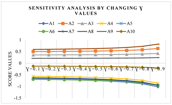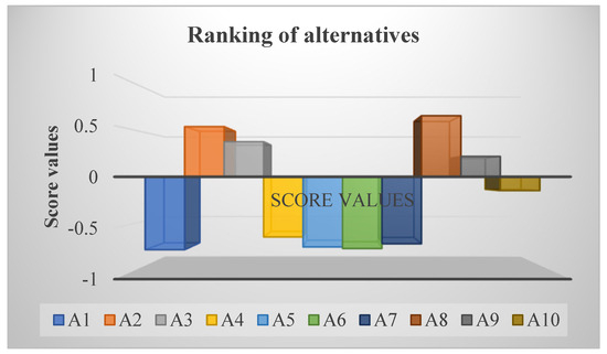 The ranking of the alternatives is presented in Table 5, which was calculated using Equations (4)–(7), with , and score values in Equation (1).