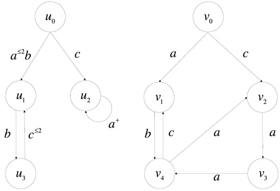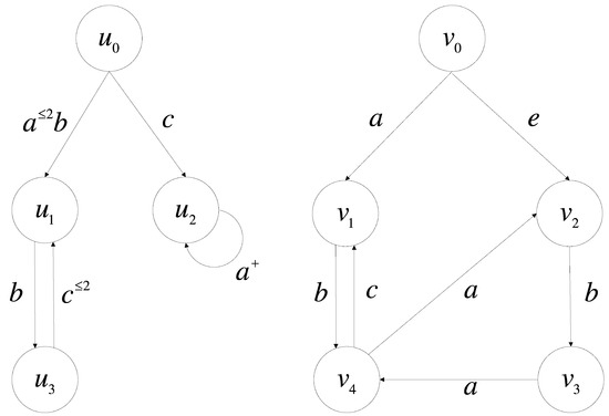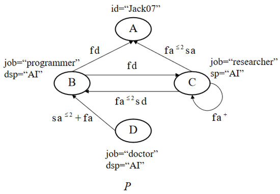 In a similar way, a pattern graph is defined as a directed graph , where (1) is the set of its nodes; (2) is a set of edges, where is the set of all regular expressions over ; (3) is a function defined on , and is the predicate of with , which is the combination of atomic expressions in op , where is an attribute, is a constant, and op is an expression for comparison operator . We use to replace . In the latter, we write by .