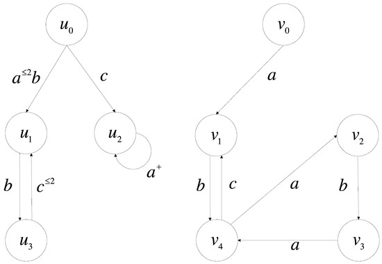 Given an - formula , for cases , , , and the semantics of on the data graph and the pattern graph are indistinguishable. However, when the formula or is considered, it becomes apparent that there is a significant difference in the semantics of Y on the data graph and the pattern graph. In the pattern graph, the semantics of are independent of parameter g, but in the data graph, the semantics of depend on parameter g. One reason for this difference is the distinct edge labels mentioned earlier for the data graph and the pattern graph. In the pattern graph, the edge labels are regular expressions, and the objects inside operators and [ ] are also regular expressions, making the semantics interpretable using classical Hennessy–Milner Logic (HML). However, the edge labels in the data graph are single characters, which, although they can be seen as regular expressions, are not interpretable using classical HML semantics. Therefore, to utilize - logic formulas for characterizing -approximate simulation relations in subsequent sections, some adjustments need to be made to the semantics interpretation of formula on the data graph.