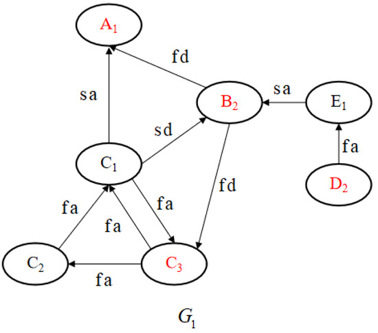 Note that, for the edge in the pattern graph , in the data graph , there is a path from node to node , and the path is . According to Proposition 2, we obtain . As for the remaining edges in the pattern graph, there are corresponding paths in the data graph, and the distance between them is less than 1. Thus, it can be concluded that the binary relation is a 1-approximate simulation relation. It can also be inferred that there exists a subgraph G1, as shown in Figure 6 in red letters, in the data graph G, satisfying the requirements of the pattern graph P.