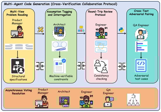 The proposed Cross-Verification Collaboration Protocol (CVCP) is a symmetry-aware multi-agent coordination framework designed to address the shortcomings of conventional single-agent and SOP-style multi-agent code generation in competitive programming. As shown in Figure 2, at a high level, CVCP decomposes the end-to-end code generation process into five specialized and interlinked modules: (1) the Round-Trip Review Protocol(RTRP), which enables bidirectional review between adjacent roles to prevent semantic drift and ensure specification fidelity; (2) Multi-View Problem Reading (MVPR), where multiple agents independently extract and formalize problem specifications, including explicit tagging of potential structural or mathematical symmetries; (3) Assumption Tagging and Interrogation (ATI), which records all design assumptions as machine-verifiable constraints subject to targeted validation; (4) Cross-Test Adversarial Pairing (CTAP), which generates and injects adversarial test cases at multiple pipeline stages, with special emphasis on symmetry-breaking and symmetry-preserving scenarios; and (5) Asynchronous Voting Resolution (AVR), which introduces consensus-based decision points for critical milestones such as algorithm selection and final code submission. Together, these modules form a closed-loop pipeline in which information flows not only downstream but also upstream and laterally, ensuring continuous verification and refinement throughout the development process.