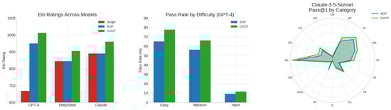 Comparison of model performance across CVCP, SOP, and single-agent baselines. (Left) Elo rating of different model backbones under three configurations (Single, SOP, CVCP), showing consistent improvement under CVCP. (Middle) Pass rate across problem difficulty levels (Easy, Medium, Hard) for GPT-4, where CVCP demonstrates notable gains on harder problems. (Right) Radar plot of pass@1 rate across 16 algorithm categories for Claude-3.5-Sonnet, illustrating the broader performance improvements brought by CVCP.