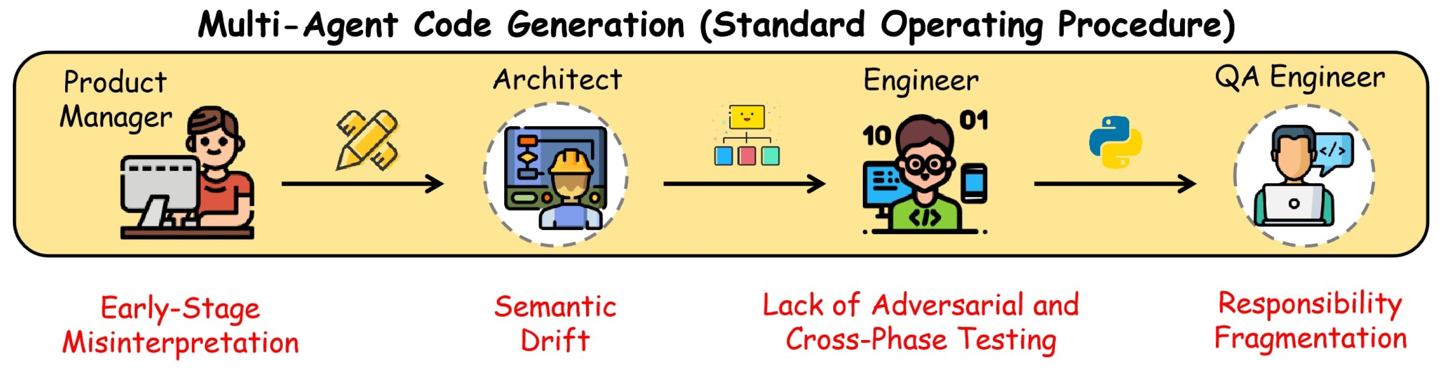 12], tasks are decomposed into sequential stages, where the output of one agent directly serves as the input for the next. In the context of code generation, a typical SOP pipeline may involve sequential roles such as a problem analyst, an algorithm designer, a code implementer, and a tester/debugger. Each role operates under the assumption that its upstream deliverable is correct, focusing solely on its assigned responsibilities. While such linear workflows are efficient for well-specified, low-complexity tasks, they rely heavily on unidirectional information flow, exhibit minimal cross-stage verification, and lack structured mechanisms for assumption tracking or back-propagating discovered errors to earlier stages.