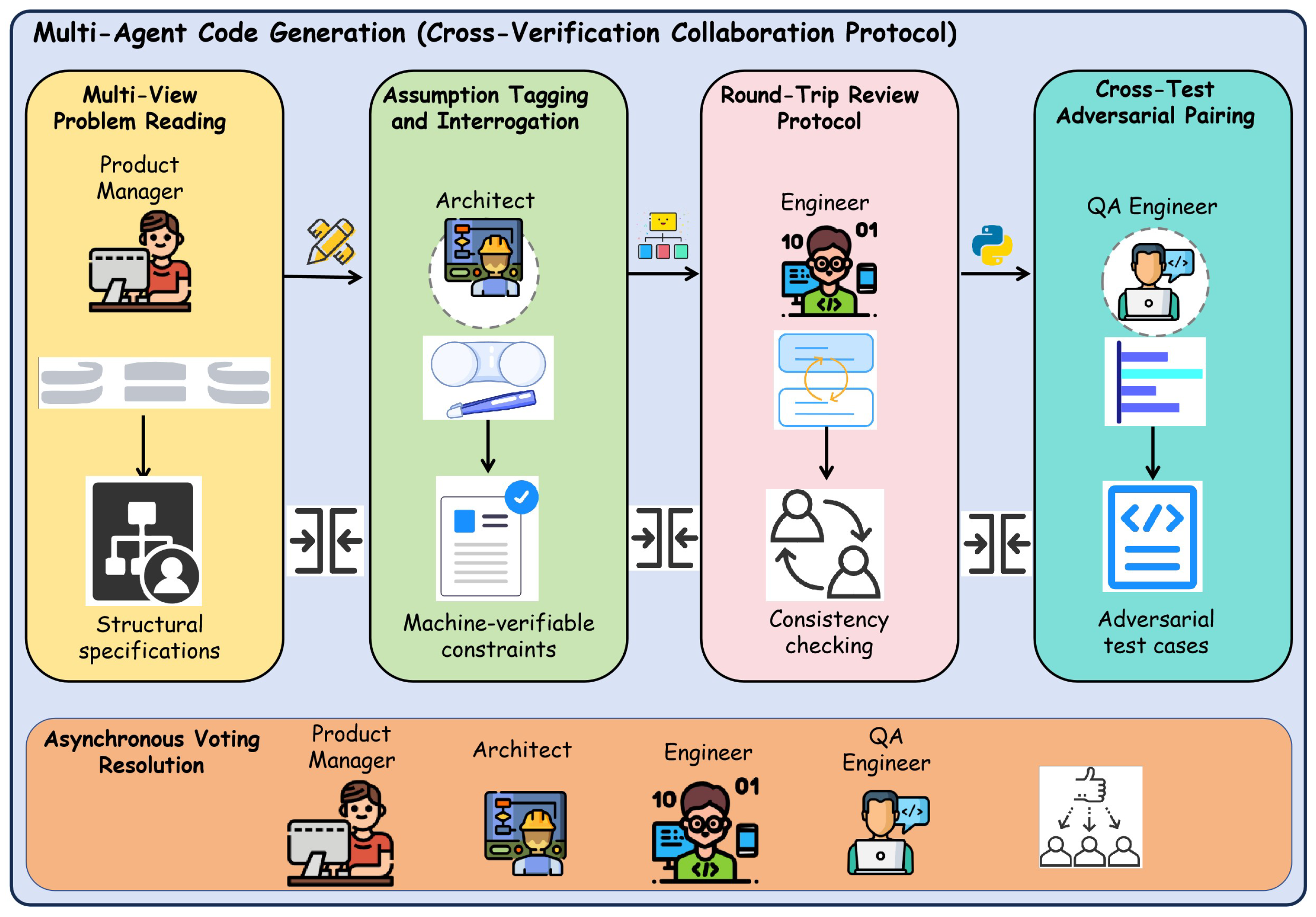 Figure 2, at a high level, CVCP decomposes the end-to-end code generation process into five specialized and interlinked modules: (1) the Round-Trip Review Protocol(RTRP), which enables bidirectional review between adjacent roles to prevent semantic drift and ensure specification fidelity; (2) Multi-View Problem Reading (MVPR), where multiple agents independently extract and formalize problem specifications, including explicit tagging of potential structural or mathematical symmetries; (3) Assumption Tagging and Interrogation (ATI), which records all design assumptions as machine-verifiable constraints subject to targeted validation; (4) Cross-Test Adversarial Pairing (CTAP), which generates and injects adversarial test cases at multiple pipeline stages, with special emphasis on symmetry-breaking and symmetry-preserving scenarios; and (5) Asynchronous Voting Resolution (AVR), which introduces consensus-based decision points for critical milestones such as algorithm selection and final code submission. Together, these modules form a closed-loop pipeline in which information flows not only downstream but also upstream and laterally, ensuring continuous verification and refinement throughout the development process.