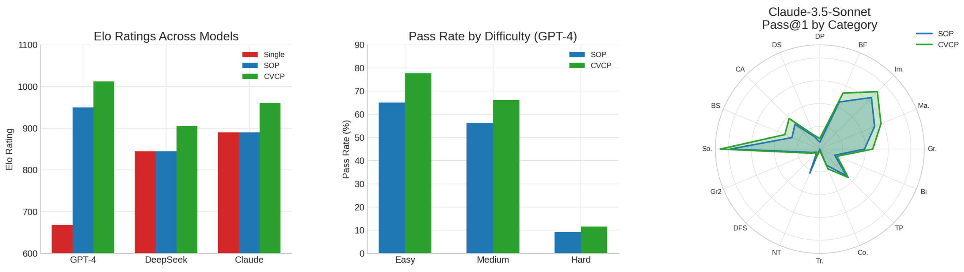 Figure 3. The figure includes Elo rating comparisons across model types, pass rates stratified by problem difficulty, and a radar chart showing category-wise accuracy gains. These visualizations complement the tabular data by providing a more intuitive understanding of performance trends, especially the robustness gains on medium and hard problems, as well as across diverse algorithmic domains. Transitioning to Multi-LLM Agents, the SOP configuration already delivers noticeable gains over the single-agent baselines, while CVCP further amplifies performance across almost all categories. For example, GPT-4 (CVCP) surpasses GPT-4 (SOP) in Greedy (Gr.) (6.20 vs. 5.15), Implementation (Im.) (15.80 vs. 13.25), and Sorting (So.) (15.40 vs. 13.00), showing that coordinated multi-agent reasoning boosts solution accuracy. Similar trends hold for DeepSeek-Coder and Claude-3.5-Sonnet, with Claude-3.5-Sonnet (CVCP) achieving the strongest overall gains—most notably in Sorting (So.) (21.80) and Combinatorial Algorithms (CA.) (9.50). These results suggest that the multi-agent CVCP design, through collaborative verification and symmetry-aware adversarial testing, effectively enhances robustness and adaptability across a wide range of algorithmic domains, particularly for harder and more reasoning-intensive problem types.