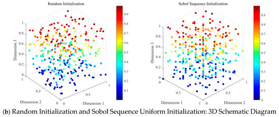 where and represent the lower bound and upper bound of the problem, respectively. Finally, the population was initialized with a uniform distribution based on the Sobol sequence, as shown below. Figure 1 shows the initial population distribution in two-dimensional and three-dimensional spaces for two scenarios: random initialization of DOA and uniform initialization of IDOA based on the Sobol sequence. As can be seen from the figure, the population distribution based on uniform initialization using the Sobol sequence is more uniform, providing a better initial population for subsequent population exploration and development.