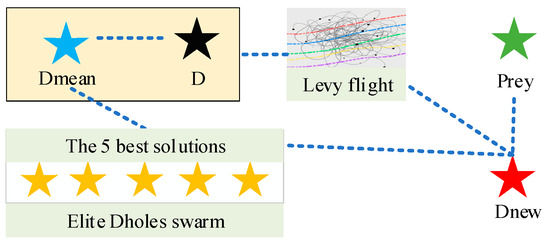 where is the gamma function. Figure 2 shows a schematic diagram of the elite Dholes population search method, which shows that the update of new individuals is influenced by the mean of the five optimal solutions, the current position, and the prey position, and through Levy flight, it has randomness of exploration and can better perform exploration.