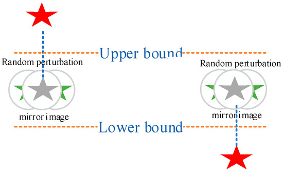 Figure 3 shows a schematic diagram of the random mirror perturbation strategy. When an individual crosses the boundary, instead of using the truncation method to return it to the boundary, the mirror method is used to return the individual to the search space. To increase the randomness of the algorithm and enable it to explore better, random perturbations are added so that even individuals that cross the boundary at the same position can be mapped to different positions in the search space, thereby ensuring the diversity of the algorithm’s population. Figure 4 depicts the flowchart of the IDOA.