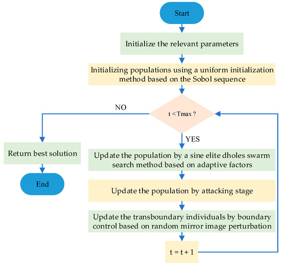 - Propose a sine elite dholes swarm search method based on adaptive factors to enable the algorithm to better utilize the current high-quality solution, rather than being limited to the current optimal solution, thereby enhancing the algorithm’s ability to escape local optima and strengthen its ability to solve high-dimensional complex problems.