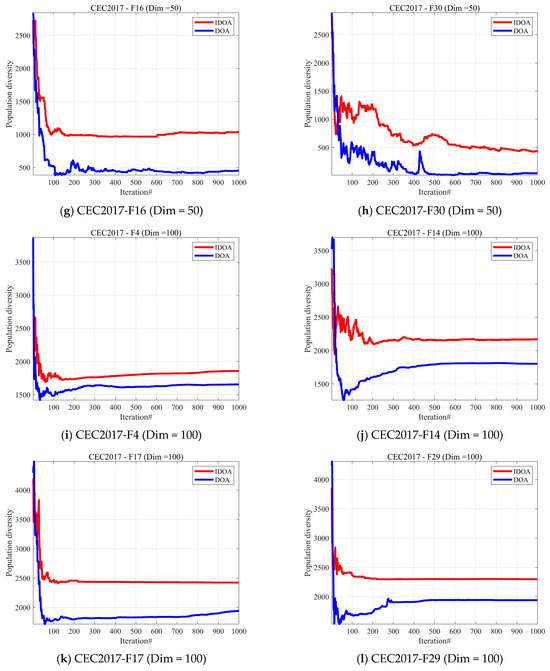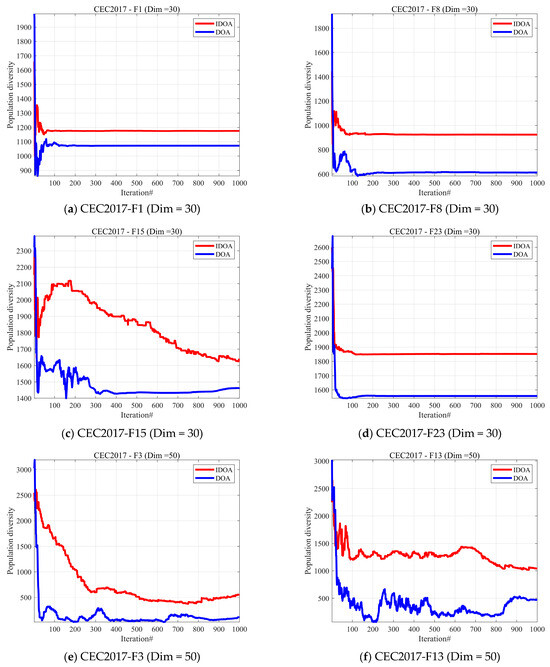 In this subsection, we conduct a qualitative analysis of the proposed IDOA [26]. We analyzed the population diversity of IDOA and DOA. Population diversity can effectively prevent individuals in the population from converging too early on local optima, thereby enhancing the algorithm’s global search capability. Therefore, maintaining the diversity of the algorithm population is a very important factor in ensuring the performance of the algorithm. In this subsection, we assess the population diversity of the IDOA, which is calculated using Equation (23).
