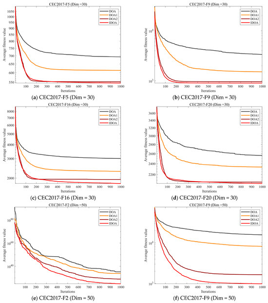 Figure 5 shows the changes in population diversity across three different dimensions on the CEC2017 test set for the two algorithms. From the experimental results, it can be seen that after improving the algorithm using the Sobol sequence uniform distribution method, population diversity shows a significant improvement. In DOA, population diversity decreases rapidly with the number of iterations and eventually stabilizes at a low level. While IDOA also sometimes decreases rapidly, the final diversity it maintains is always higher than that of DOA. This demonstrates that the Sobol sequence uniform distribution method effectively improves the population diversity of the algorithm.