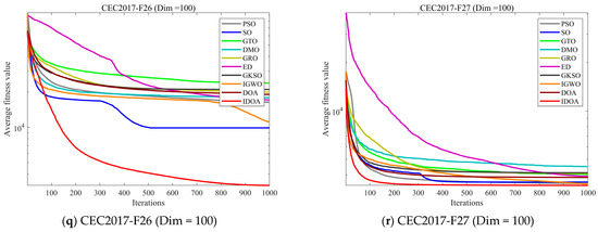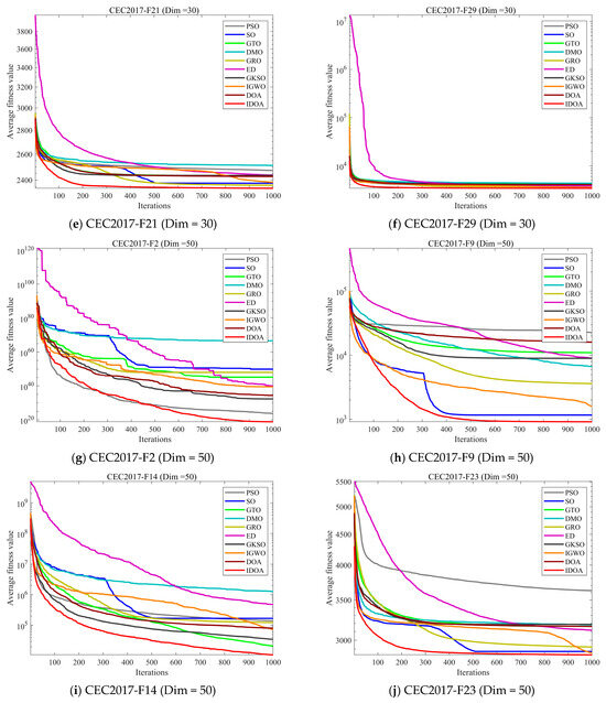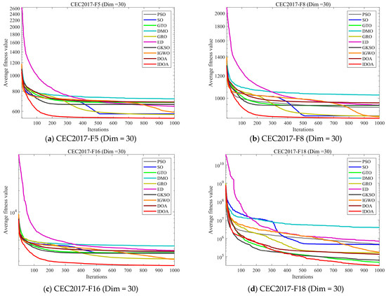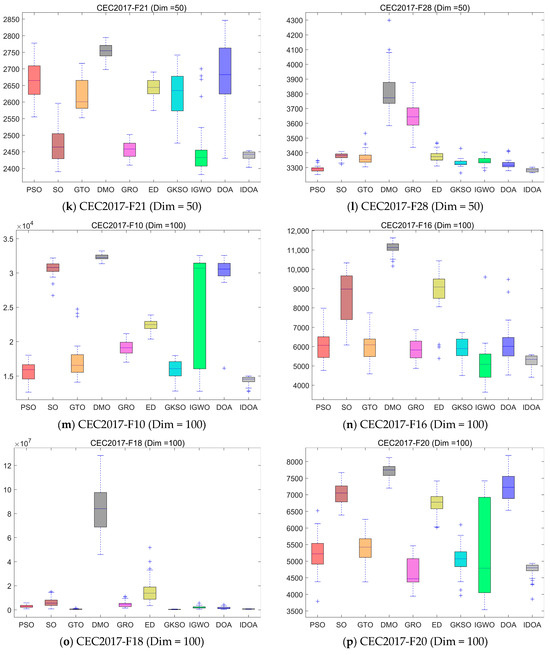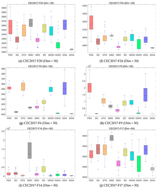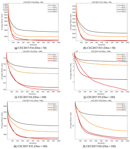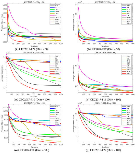 Table 2, Table 3 and Table 4 show the mean and standard deviation of fitness for each algorithm running independently 30 times in three dimensions, where mean represents the average value of 30 runs and std represents the standard deviation of 30 runs. The experimental results show that although IDOA cannot achieve good results in some functions, its results are still among the top of all comparison algorithms and its standard deviation is relatively small, indicating that although IDOA sometimes cannot find the optimal solution, its performance is very stable, which is very important when we deal with practical problems.