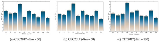 Figure 10 shows the final rankings of the 10 algorithms on the CEC2017 test set. The experimental results show that IDOA ranks lowest on average in all three dimensions of the CEC2017 test set, meaning that IDOA ranks first among all comparison algorithms. Among them, in the case of 30 dimensions, IDOA ranked first, while DOA only ranked seventh, proving that the improved strategy proposed in this paper has a significant effect. In the case of 50 and 100 dimensions, the DOA ranking is 8th, indicating that the DOA performs poorly in high dimensions, while the IDOA performs well not only in low dimensions but also in high dimensions.