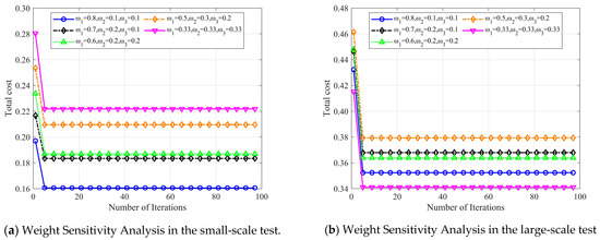 In this section, to assess the impact of each cost component on total costs, we conducted a parameter sensitivity analysis based on weighting. We set the weights for the three cost components to 0.8, 0.1, 0.1; 0.7, 0.2, 0.1; 0.6, 0.2, 0.2; 0.5, 0.3, 0.2; and 0.33, 0.33, 0.33, respectively, for experimental analysis. The results are shown in Figure 11.