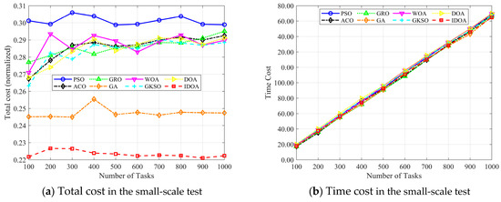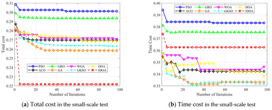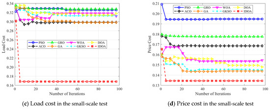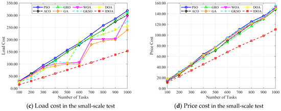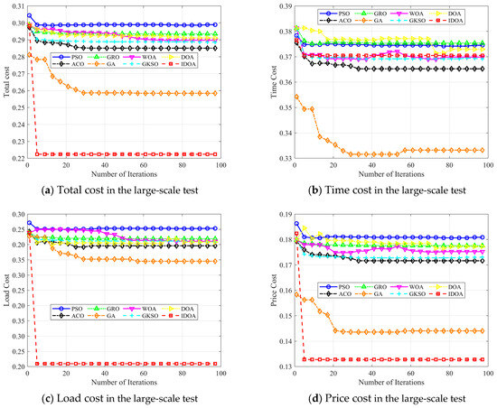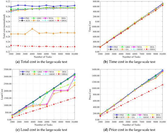 Figure 12a–d show the changes in total cost, time cost, load cost, and price cost as the number of iterations increases, with 100 tasks. The experimental results show that although IDOA achieved a poor result in terms of time cost, it achieved a very good result in terms of total cost. In particular, the load was well balanced, ultimately giving it a significant advantage in terms of total cost among all the algorithms compared.