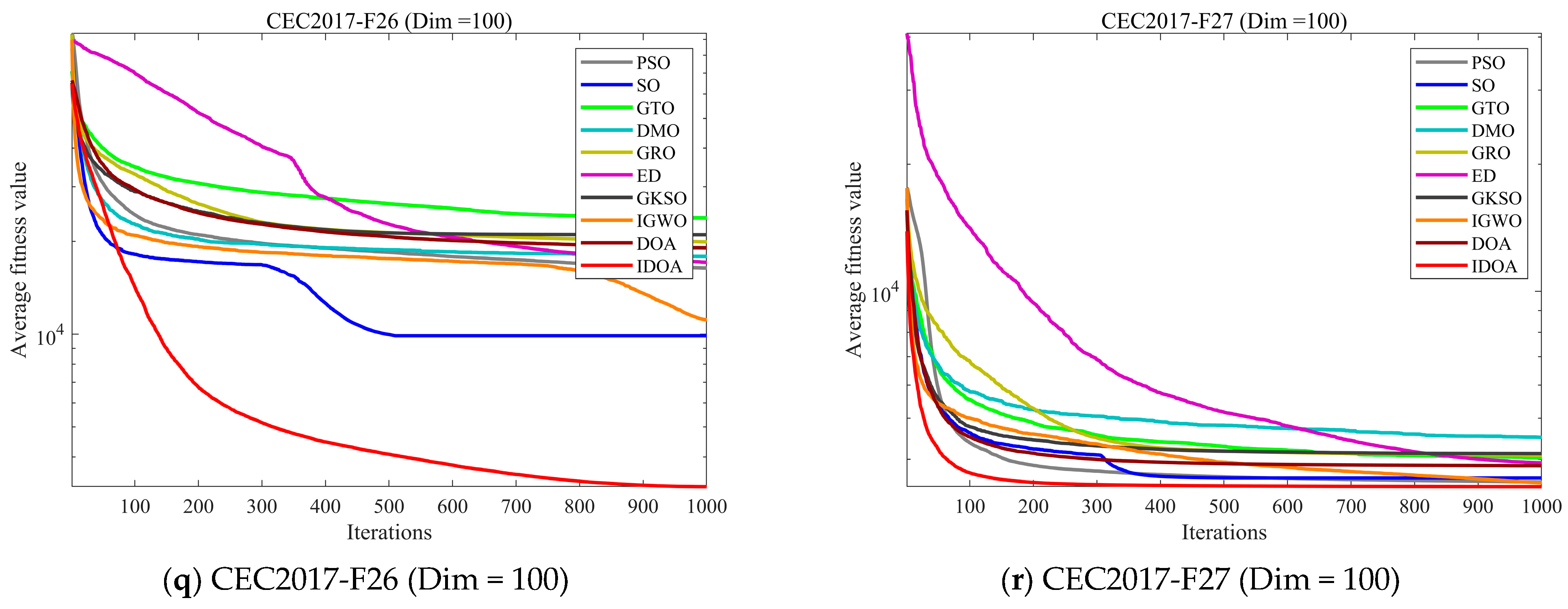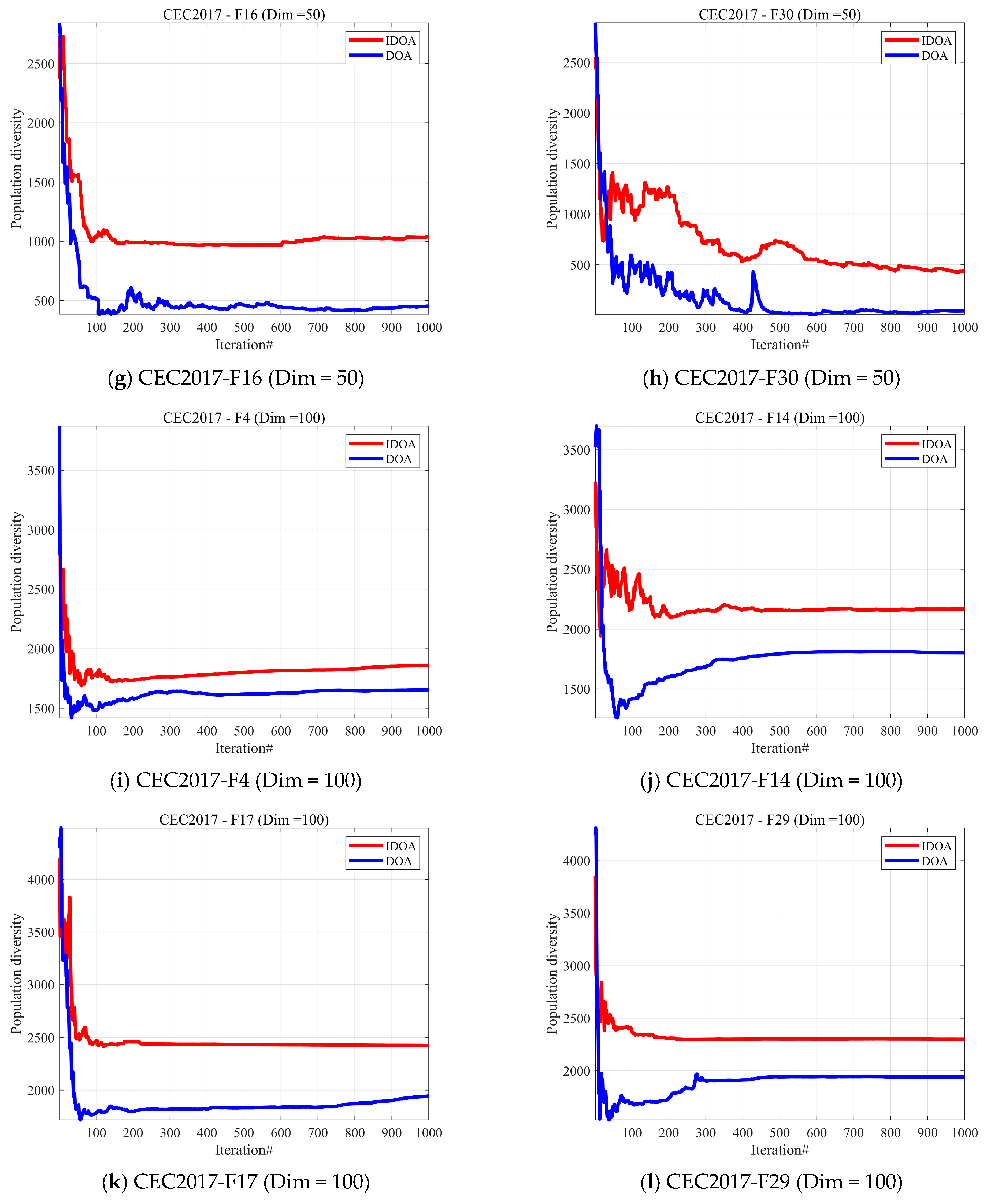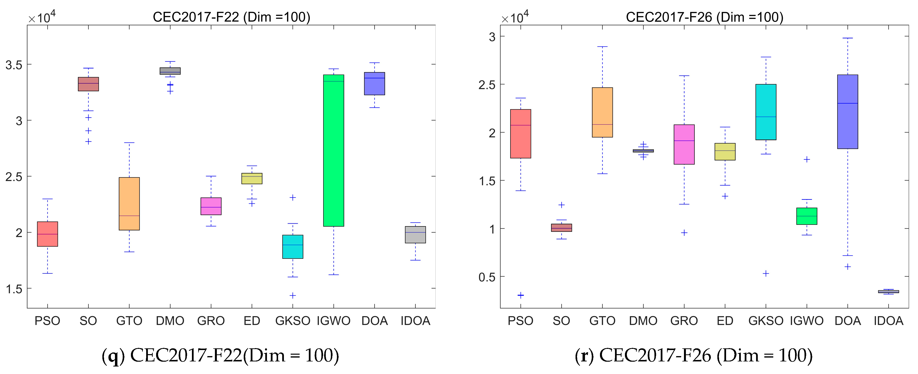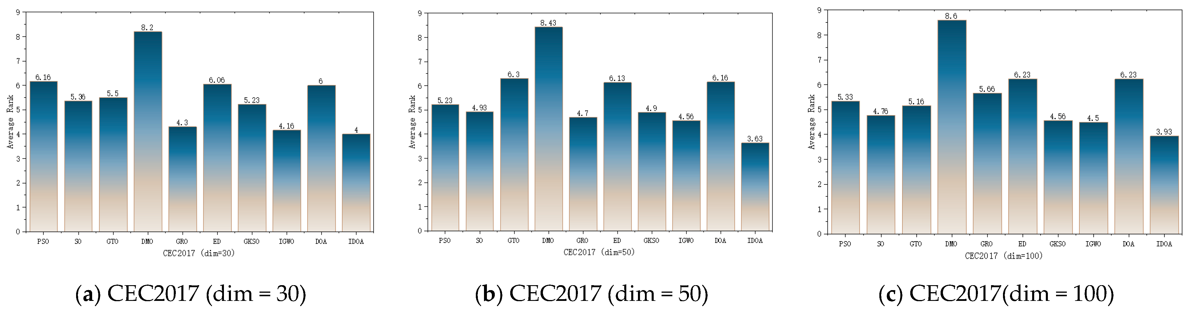 • The algorithms were qualitatively analyzed using 30 test functions from the IEEE CEC2017 test set and compared with 9 other algorithms to obtain competitive results. Most importantly, the algorithms were statistically analyzed to fully analyze the superior performance of IDOA.